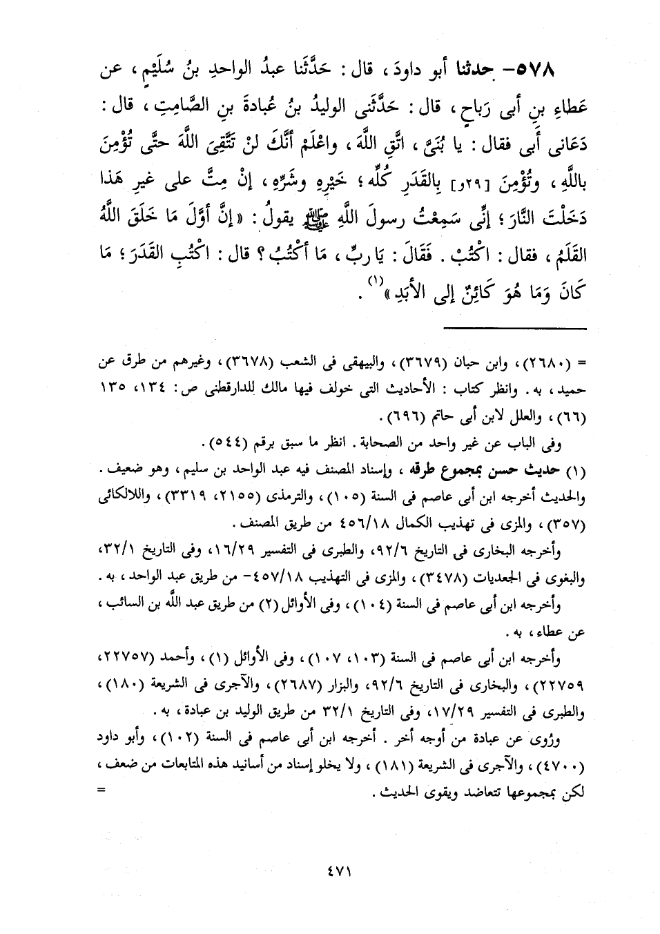 578 - حَدَّثَنَا أَبُو دَاوُدَ قَالَ: حَدَّثَنَا عَبْدُ الْوَاحِدِ بْنُ سُلَيْمٍ، عَنْ عَطَاءِ بْنِ أَبِي رَبَاحٍ، قَالَ: حَدَّثَنِي الْوَلِيدُ بْنُ عُبَادَةَ بْنِ الصَّامِتِ، قَالَ: دَعَانِي أَبِي فَقَالَ: يَا بُنَيَّ اتَّقِ اللَّهَ وَاعْلَمْ أَنَّكَ لَنْ تَتَّقِيَ اللَّهَ حَتَّى تُؤْمِنَ بِاللَّهِ وَتُؤْمِنَ بِالْقَدَرِ كُلِّهِ خَيْرِهِ وَشَرِّهِ إِنْ مِتَّ عَلَى غَيْرِ هَذَا دَخَلْتَ النَّارَ إِنِّي سَمِعْتُ رَسُولَ اللَّهِ صَلَّى اللهُ عَلَيْهِ وَسَلَّمَ يَقُولُ: إِنَّ §أَوَّلَ مَا خَلَقَ اللَّهُ الْقَلَمُ فَقَالَ: «اكْتُبْ» فَقَالَ: يَا رَبِّ مَا أَكْتُبُ؟ قَالَ: «اكْتُبِ الْقَدَرَ مَا كَانَ وَمَا هُوَ كَائِنٌ إِلَى الْأَبَدِ»