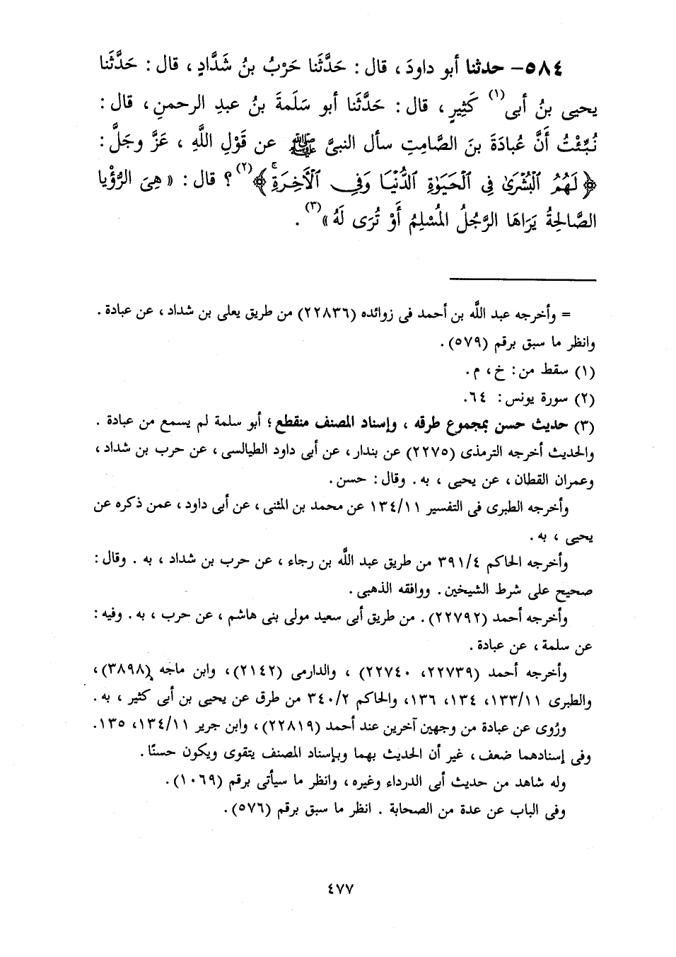584 - حَدَّثَنَا أَبُو دَاوُدَ قَالَ: حَدَّثَنَا حَرْبُ بْنُ شَدَّادٍ، قَالَ: حَدَّثَنَا يَحْيَى بْنُ أَبِي كَثِيرٍ، قَالَ: حَدَّثَنَا أَبُو سَلَمَةَ بْنُ عَبْدِ الرَّحْمَنِ، قَالَ: نُبِّئْتُ أَنَّ عُبَادَةَ بْنَ الصَّامِتِ، سَأَلَ النَّبِيَّ صَلَّى اللهُ عَلَيْهِ وَسَلَّمَ عَنْ قَوْلِ اللَّهِ عَزَّ وَجَلَّ {لَهُمُ الْبُشْرَى فِي الْحَيَاةِ الدُّنْيَا وَفِي الْآخِرَةِ} [يونس: 64] قَالَ: «§هِيَ الرُّؤْيَا الصَّالِحَةُ يَرَاهَا الرَّجُلُ الْمُسْلِمُ أَوْ تُرَى لَهُ»