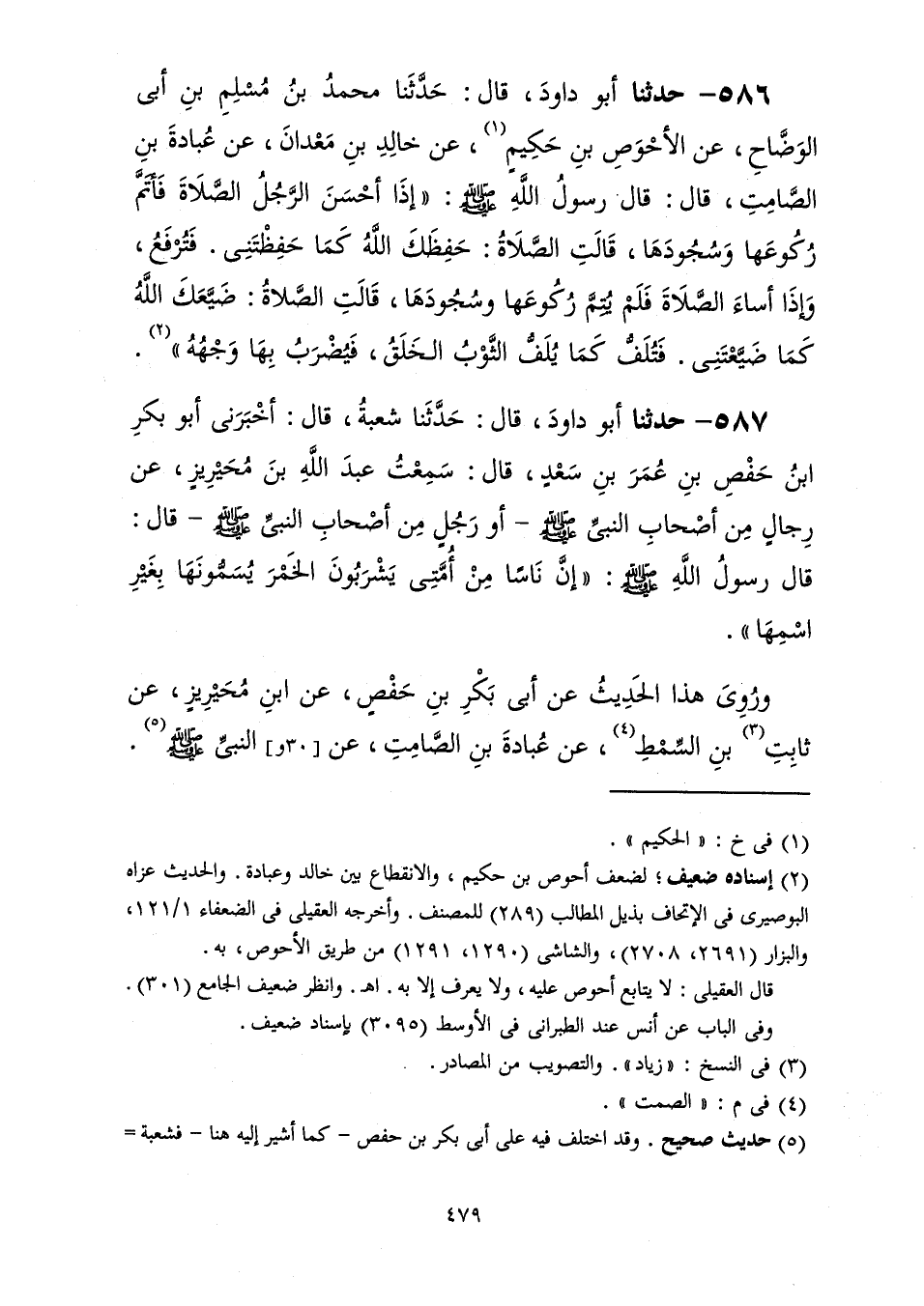 586 - حَدَّثَنَا أَبُو دَاوُدَ قَالَ: حَدَّثَنَا مُحَمَّدُ بْنُ مُسْلِمِ بْنِ أَبِي الْوَضَّاحِ، عَنِ الْأَحْوَصِ بْنِ حَكِيمٍ، عَنْ خَالِدِ بْنِ مَعْدَانَ، عَنْ عُبَادَةَ بْنِ الصَّامِتِ، قَالَ: قَالَ رَسُولُ اللَّهِ صَلَّى اللهُ عَلَيْهِ وَسَلَّمَ: " §إِذَا أَحْسَنَ الرَّجُلُ الصَّلَاةَ فَأَتَمَّ رُكُوعَهَا وَسُجُودَهَا قَالَتِ الصَّلَاةُ: حَفِظَكَ اللَّهُ كَمَا حَفِظْتَنِي فَتُرْفَعُ، وَإِذَا أَسَاءَ الصَّلَاةَ فَلَمْ يُتِمَّ رُكُوعَهَا وَسُجُودَهَا قَالَتِ الصَّلَاةُ: ضَيَّعَكَ اللَّهُ كَمَا ضَيَّعْتَنِي فَتُلَفُّ كَمَا يُلَفُّ الثَّوْبُ الْخَلَقُ فَيُضْرَبُ بِهَا وَجْهُهُ "