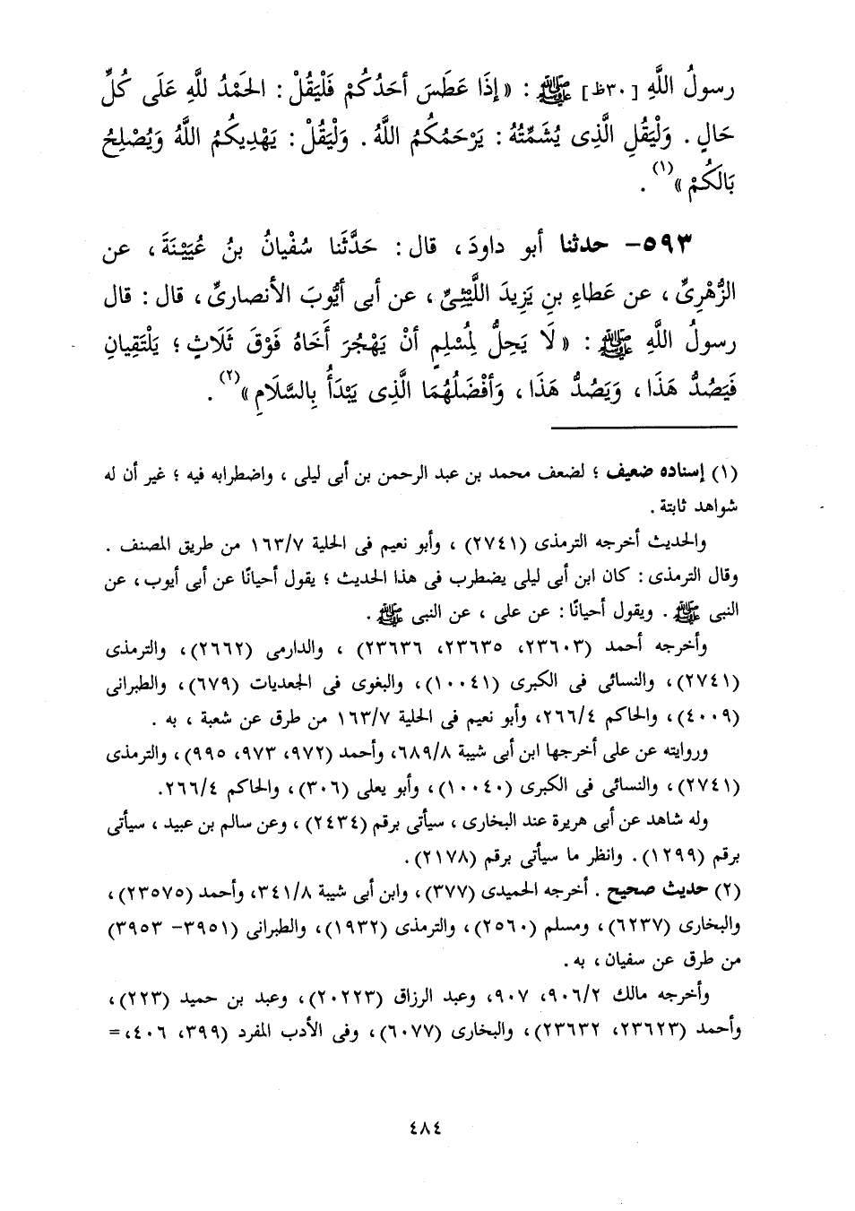 593 - حَدَّثَنَا أَبُو دَاوُدَ قَالَ: حَدَّثَنَا سُفْيَانُ بْنُ عُيَيْنَةَ، عَنِ الزُّهْرِيِّ، عَنْ عَطَاءِ بْنِ يَزِيدَ اللَّيْثِيِّ، عَنْ أَبِي أَيُّوبَ الْأَنْصَارِيِّ، قَالَ: قَالَ رَسُولُ اللَّهِ صَلَّى اللهُ عَلَيْهِ وَسَلَّمَ: «§لَا يَحِلُّ لِمُسْلِمٍ أَنْ يَهْجُرَ أَخَاهُ فَوْقَ ثَلَاثٍ يَلْتَقِيَانِ فَيَصُدُّ هَذَا وَيَصُدُّ هَذَا وَأَفْضَلُهُمَا الَّذِي يَبْدَأُ بِالسَّلَامِ»