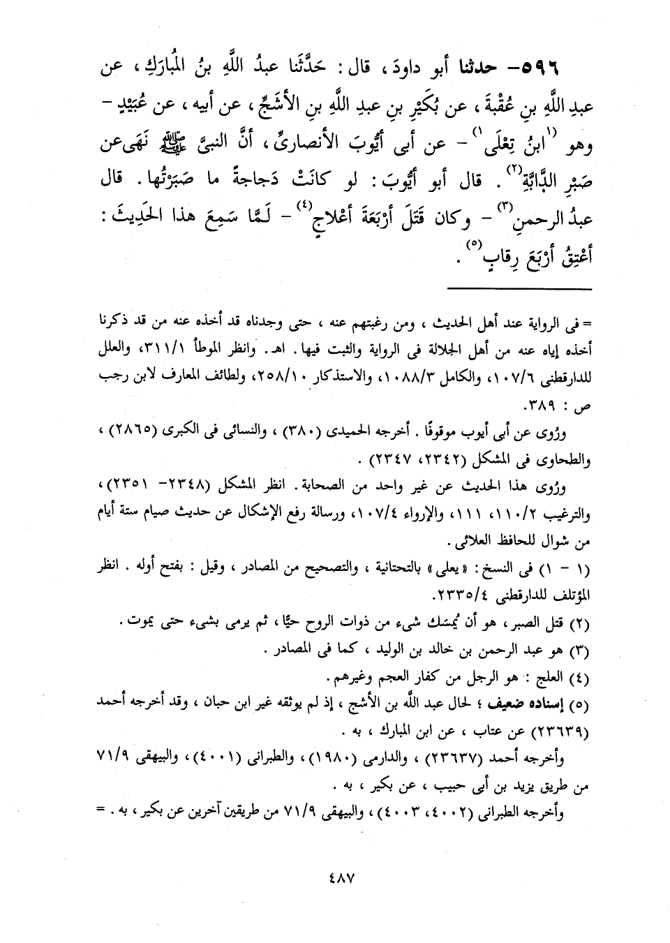 596 - حَدَّثَنَا أَبُو دَاوُدَ قَالَ: حَدَّثَنَا عَبْدُ اللَّهِ بْنُ الْمُبَارَكِ، عَنْ عَبْدِ اللَّهِ بْنِ عُقْبَةَ، عَنْ بُكَيْرِ بْنِ عَبْدِ اللَّهِ بْنِ الْأَشَجِّ، عَنْ أَبِيهِ، عَنْ عُبَيْدٍ وَهُوَ ابْنُ تِعْلَى، عَنْ أَبِي أَيُّوبَ الْأَنْصَارِيِّ، أَنَّ النَّبِيَّ صَلَّى اللهُ عَلَيْهِ وَسَلَّمَ «§نَهَى عَنْ صَبْرِ الدَّابَّةِ» ، قَالَ أَبُو أَيُّوبَ: لَوْ كَانَتْ دَجَاجَةً مَا صَبَرْتُهَا قَالَ عَبْدُ الرَّحْمَنِ وَكَانَ قَتَلَ أَرْبَعَةَ أَعْلَاجٍ لَمَّا سَمِعَ هَذَا الْحَدِيثَ: أَعْتِقُ أَرْبَعَ رِقَابٍ