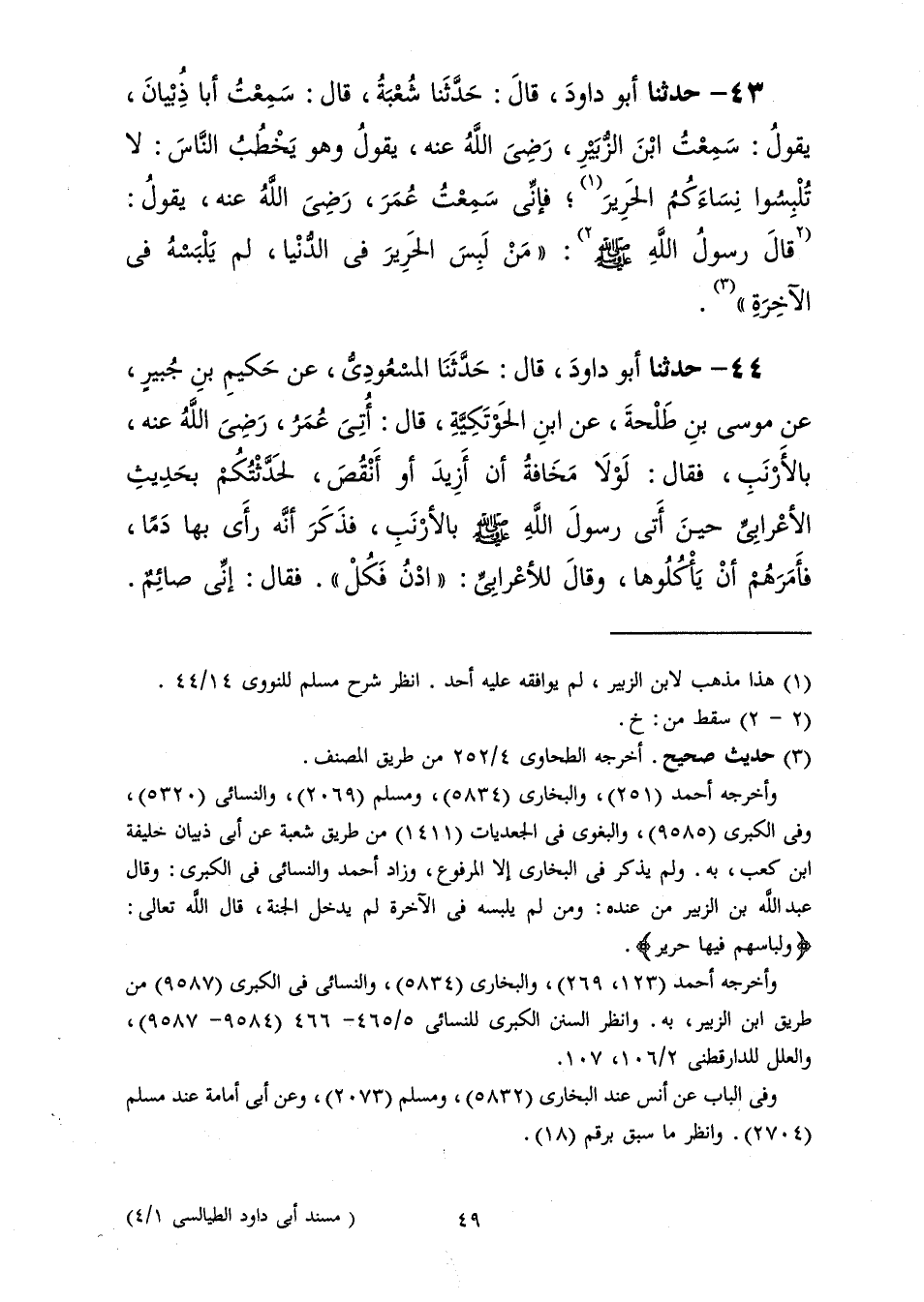 43 - حَدَّثَنَا أَبُو دَاوُدَ قَالَ: حَدَّثَنَا شُعْبَةُ، قَالَ: سَمِعْتُ أَبَا ذُبْيَانَ، يَقُولُ: سَمِعْتُ ابْنَ الزُّبَيْرِ رَضِيَ اللَّهُ عَنْهُ، يَقُولُ وَهُوَ يَخْطُبُ النَّاسَ: لَا تُلْبِسُوا نِسَاءَكُمُ الْحَرِيرَ فَإِنِّي سَمِعْتُ عُمَرَ رَضِيَ اللَّهُ عَنْهُ يَقُولُ: قَالَ رَسُولُ اللَّهِ صَلَّى اللهُ عَلَيْهِ وَسَلَّمَ: «§مَنْ لَبِسَ الْحَرِيرَ فِي الدُّنْيَا لَمْ يَلْبَسْهُ فِي الْآخِرَةِ»