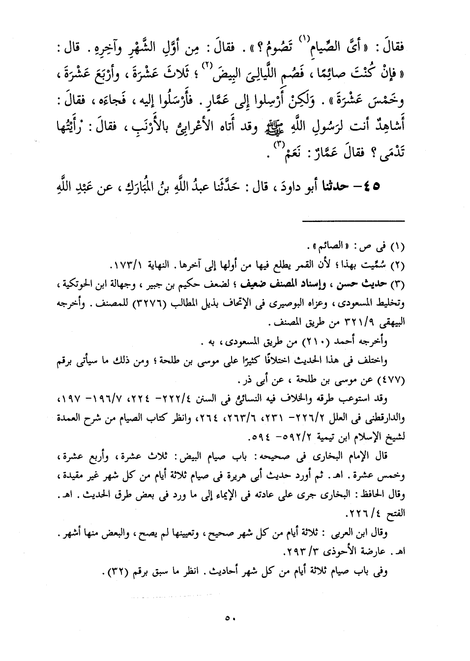 45 - حَدَّثَنَا أَبُو دَاوُدَ قَالَ: حَدَّثَنَا عَبْدُ اللَّهِ بْنُ الْمُبَارَكِ، عَنْ عَبْدِ اللَّهِ -[51]- بْنِ عُقْبَةَ الْحَضْرَمِيِّ، عَنْ عَطَاءِ بْنِ دِينَارٍ الْهُذَلِيِّ، عَنْ أَبِي يَزِيدَ الْخَوْلَانِيِّ، أَنَّهُ سَمِعَ فَضَالَةَ بْنَ عُبَيْدٍ الْأَنْصَارِيَّ، يَقُولُ: سَمِعْتُ عُمَرَ بْنَ الْخَطَّابِ رَضِيَ اللَّهُ عَنْهُ، يَقُولُ: سَمِعْتُ رَسُولَ اللَّهِ صَلَّى اللهُ عَلَيْهِ وَسَلَّمَ يَقُولُ: «§الشُّهَدَاءُ أَرْبَعَةٌ فَمُؤْمِنٌ جَيِّدُ الْإِيمَانِ لَقِيَ الْعَدُوَّ فَصَدَقَ اللَّهَ فَقَاتَلَ حَتَّى يُقْتَلَ فَذَلِكَ الَّذِي يَرْفَعُ النَّاسُ إِلَيْهِ أَعْيُنَهُمْ - وَرَفَعَ رَأْسَهُ حَتَّى وَقَعَتْ قَلَنْسُوَةٌ كَانَتْ عَلَى رَأْسِهِ، أَوْ عَلَى رَأْسِ عُمَرَ» فَهَذَا فِي الدَّرَجَةِ الْأُولَى - وَرَجُلٌ مُؤْمِنٌ جَيِّدُ الْإِيمَانِ إِذَا لَقِيَ الْعَدُوَّ كَأَنَّمَا يَضْرِبُ جِلْدَهُ شَوْكُ الطَّلْحِ مِنَ الْجُبْنِ أَتَاهُ سَهْمُ غَرْبٍ فَقَتَلَهُ فَهَذَا فِي الدَّرَجَةِ الثَّانِيَةِ، وَرَجُلٌ مُؤْمِنٌ خَلَطَ عَمَلًا صَالِحًا وَآخَرَ سَيِّئًا لَقِيَ الْعَدُوَّ فَصَدَقَ اللَّهُ حَتَّى قُتِلَ فَهَذَا فِي الدَّرَجَةِ الثَّالِثَةِ، وَرَجُلٌ أَسْرَفَ عَلَى نَفْسِهِ فَلَقِيَ الْعَدُوَّ فَقَاتَلَ حَتَّى قُتِلَ فَهَذَا فِي الدَّرَجَةِ الرَّابِعَةِ "