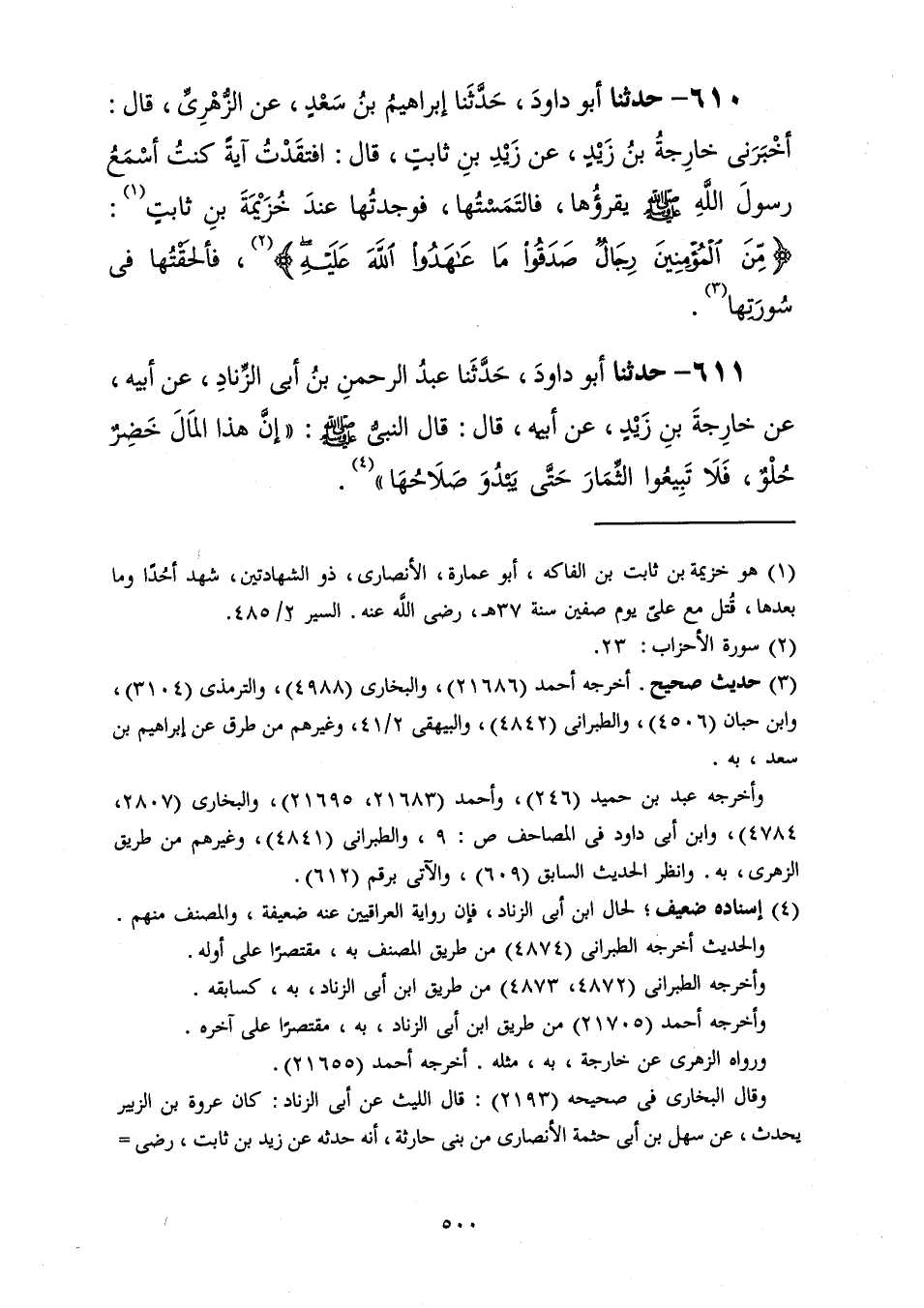 610 - حَدَّثَنَا أَبُو دَاوُدَ قَالَ: حَدَّثَنَا إِبْرَاهِيمُ بْنُ سَعْدٍ، عَنِ الزُّهْرِيِّ، قَالَ: أَخْبَرَنِي خَارِجَةُ بْنُ زَيْدٍ، عَنْ زَيْدِ بْنِ ثَابِتٍ، قَالَ: " §افْتَقَدْتُ آيَةً كُنْتُ أَسْمَعُ رَسُولَ اللَّهِ صَلَّى اللهُ عَلَيْهِ وَسَلَّمَ يَقْرَؤُهَا، فَالْتَمَسْتُهَا، فَوَجَدْتُهَا عِنْدَ خُزَيْمَةَ بْنِ ثَابِتٍ {مِنَ الْمُؤْمِنِينَ رِجَالٌ صَدَقُوا مَا عَاهَدُوا اللَّهَ عَلَيْهِ} [الأحزاب: 23] فَأَلْحَقْتُهَا فِي سُورَتِهَا "
