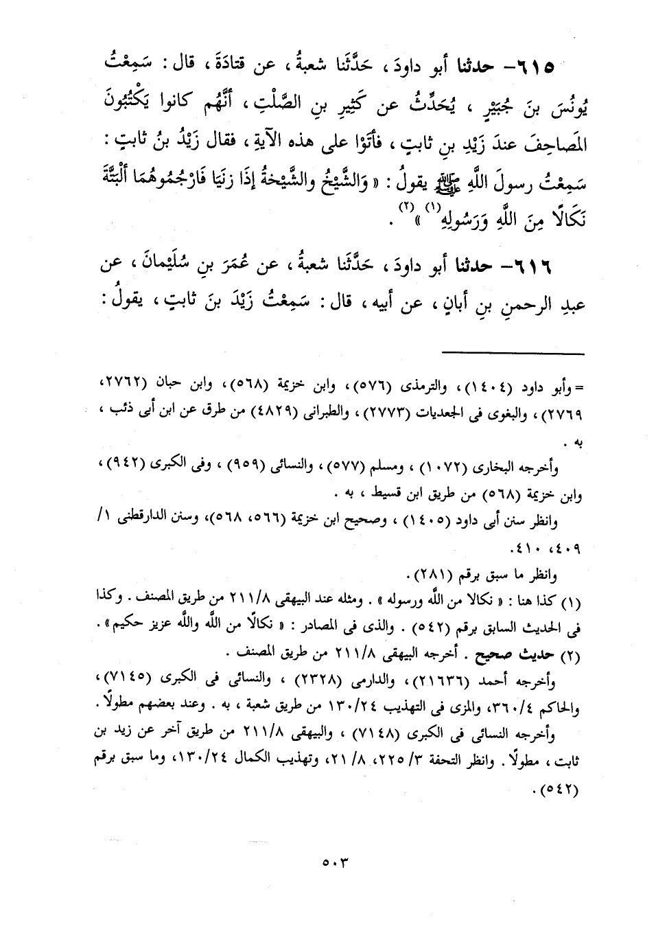 615 - حَدَّثَنَا أَبُو دَاوُدَ قَالَ: حَدَّثَنَا شُعْبَةُ، عَنْ قَتَادَةَ، قَالَ: سَمِعْتُ يُونُسَ بْنَ جُبَيْرٍ، يُحَدِّثُ عَنْ كَثِيرِ بْنِ الصَّلْتِ، أَنَّهُمْ كَانُوا يَكْتُبُونَ الْمَصَاحِفَ عِنْدَ زَيْدِ بْنِ ثَابِتٍ، فَأَتَوْا عَلَى هَذِهِ الْآيَةِ، فَقَالَ زَيْدُ بْنُ ثَابِتٍ: سَمِعْتُ رَسُولَ اللَّهِ صَلَّى اللهُ عَلَيْهِ وَسَلَّمَ يَقُولُ: «§وَالشَّيْخُ وَالشَّيْخَةُ إِذَا زَنَيَا فَارْجُمُوهُمَا أَلْبَتَّةَ نَكَالًا مِنَ اللَّهِ وَرَسُولِهِ»