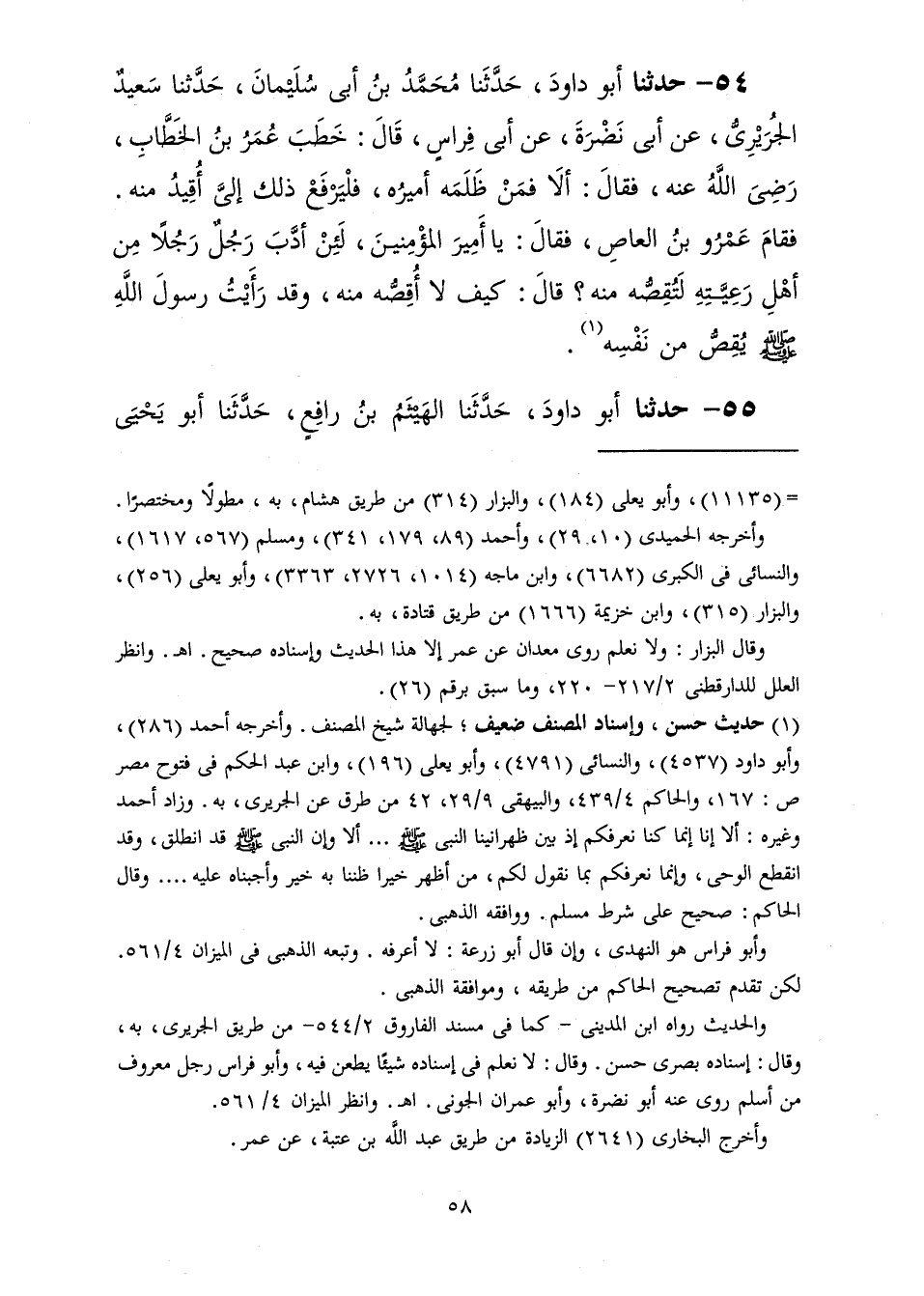 54 - حَدَّثَنَا أَبُو دَاوُدَ، حَدَّثَنَا مُحَمَّدُ بْنُ أَبِي سُلَيْمَانَ، حَدَّثَنَا سَعِيدٌ الْجُرَيْرِيُّ، عَنْ أَبِي نَضْرَةَ، عَنْ أَبِي فِرَاسٍ، قَالَ: خَطَبَ عُمَرُ بْنُ الْخَطَّابِ رَضِيَ اللَّهُ عَنْهُ فَقَالَ: " أَلَا فَمَنْ ظَلَمَهُ أَمِيرُهُ فَلْيَرْفَعْ ذَلِكَ إِلَيَّ أُقِيدُ مِنْهُ، فَقَامَ عَمْرُو بْنُ الْعَاصِ فَقَالَ: يَا أَمِيرَ الْمُؤْمِنِينَ لَئِنْ أَدَّبَ رَجُلٌ رَجُلًا مِنْ أَهْلِ رَعِيَّتِهِ لَتُقِصُّهُ مِنْهُ؟ قَالَ: كَيْفَ لَا أُقِصُّهُ مِنْهُ وَقَدْ «§رَأَيْتُ رَسُولَ اللَّهِ صَلَّى اللهُ عَلَيْهِ وَسَلَّمَ يُقِصُّ مِنْ نَفْسِهِ»