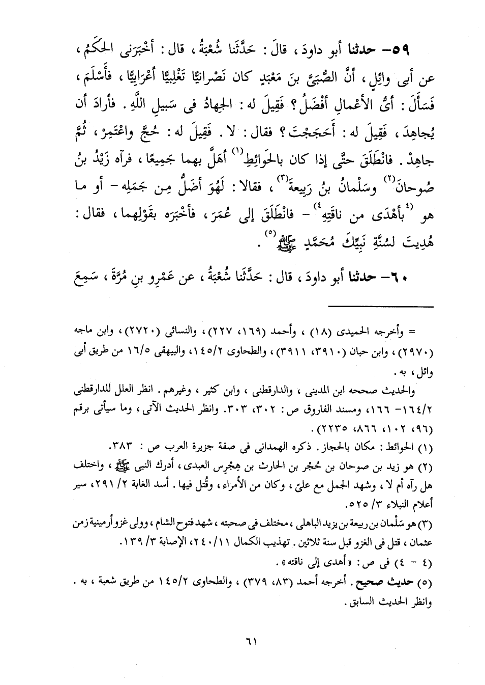 59 - حَدَّثَنَا أَبُو دَاوُدَ قَالَ: حَدَّثَنَا شُعْبَةُ، قَالَ: أَخْبَرَنِي الْحَكَمُ، عَنْ أَبِي وَائِلٍ، أَنَّ الصُّبَيَّ بْنَ مَعْبَدٍ كَانَ نَصْرَانِيًّا تَغْلِبِيًّا أَعْرَابِيًّا، فَأَسْلَمَ فَسَأَلَ: §أَيُّ الْأَعْمَالِ أَفْضَلُ؟ فَقِيلَ لَهُ: الْجِهَادُ فِي سَبِيلِ اللَّهِ فَأَرَادَ أَنْ يُجَاهِدَ فَقِيلَ لَهُ: أَحَجَجْتَ؟ فَقَالَ: لَا فَقِيلَ لَهُ: حُجَّ وَاعْتَمِرْ ثُمَّ جَاهِدْ فَانْطَلَقَ حَتَّى إِذَا كَانَ بِالْحَوَائِطِ أَهَلَّ بِهِمَا جَمِيعًا فَرَآهُ زَيْدُ بْنُ صُوحَانَ وَسَلْمَانُ بْنُ رَبِيعَةَ فَقَالَا: لَهُوَ أَضَلُّ مِنْ جَمَلِهِ أَوْ مَا هُوَ بِأَهْدَى مِنْ نَاقَتِهِ فَانْطَلَقَ إِلَى عُمَرَ فَأَخْبَرَهُ بِقَوْلِهِمَا فَقَالَ: «هُدِيتَ لِسُنَّةِ نَبِيِّكَ مُحَمَّدٍ صَلَّى اللهُ عَلَيْهِ وَسَلَّمَ»