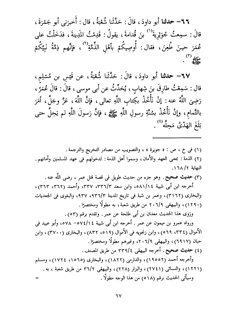 66 - حَدَّثَنَا أَبُو دَاوُدَ قَالَ: حَدَّثَنَا شُعْبَةُ، قَالَ: أَخْبَرَنِي أَبُو جَمْرَةَ، قَالَ: سَمِعْتُ جُوَيْرِيَةَ بْنَ قُدَامَةَ، يَقُولُ: قَدِمْتُ الْمَدِينَةَ فَدَخَلْتُ عَلَى عُمَرَ حِينَ طُعِنَ فَقَالَ: «§أُوصِيكُمْ بِأَهْلِ الذِّمَّةِ فَإِنَّهُمْ ذِمَّةُ نَبِيِّكُمْ صَلَّى اللهُ عَلَيْهِ وَسَلَّمَ»