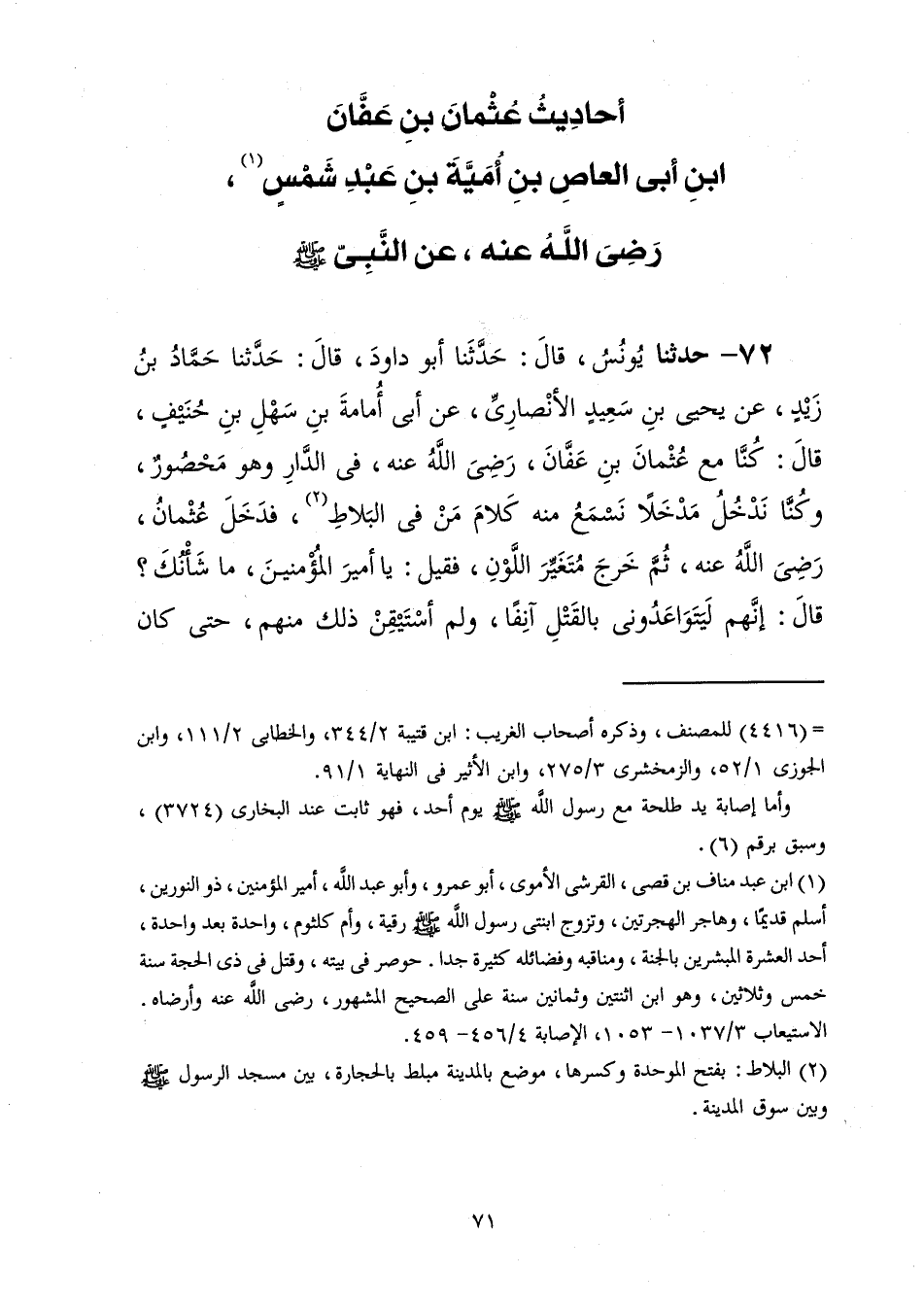72 - حَدَّثَنَا يُونُسُ، حَدَّثَنَا أَبُو دَاوُدَ قَالَ: قَالَ: حَدَّثَنَا حَمَّادُ بْنُ زَيْدٍ، عَنْ يَحْيَى بْنِ سَعِيدٍ الْأَنْصَارِيِّ، عَنْ أَبِي أُمَامَةَ بْنِ سَهْلِ بْنِ حُنَيْفٍ، قَالَ: كُنَّا مَعَ عُثْمَانَ بْنِ عَفَّانَ رَضِيَ اللَّهُ عَنْهُ فِي الدَّارِ وَهُوَ مَحْصُورٌ وَكُنَّا نَدْخُلُ مَدْخَلًا نَسْمَعُ مِنْهُ كَلَامَ مَنْ فِي الْبَلَاطِ فَدَخَلَ عُثْمَانُ رَضِيَ اللَّهُ عَنْهُ ثُمَّ خَرَجَ مُتَغَيِّرَ اللَّوْنِ فَقِيلَ: يَا أَمِيرَ الْمُؤْمِنِينَ مَا شَأْنُكَ؟ قَالَ: إِنَّهُمْ لَيَتَوَاعَدُونِّي بِالْقَتْلِ آنِفًا وَلَمْ أَسْتَيْقِنْ ذَلِكَ مِنْهُمْ حَتَّى كَانَ -[72]- الْيَوْمَ فَقُلْنَا: يَكْفِيكَهُمُ اللَّهُ يَا أَمِيرَ الْمُؤْمِنِينَ قَالَ: وَبِمَ يَقْتُلُونِي؟ وَقَدْ سَمِعْتُ رَسُولَ اللَّهِ صَلَّى اللهُ عَلَيْهِ وَسَلَّمَ يَقُولُ: " §لَا يَحِلُّ دَمُ امْرِئٍ مُسْلِمٍ إِلَّا بِإِحْدَى ثَلَاثٍ: رَجُلٌ كَفَرَ بَعْدَ إِسْلَامِهِ أَوْ زَنَى بَعْدَ إِحْصَانِهِ أَوْ قَتَلَ نَفْسًا بِغَيْرِ نَفْسٍ "، فَوَاللَّهِ مَا زَنَيْتُ فِي الْجَاهِلِيَّةِ وَلَا فِي الْإِسْلَامِ قَطُّ وَلَا أَحْبَبْتُ بِدِينِي بَدَلًا مُنْذُ هَدَانِي اللَّهُ عَزَّ وَجَلَّ وَمَا قَتَلْتُ نَفْسًا فَعَلَامَ يُرِيدُ هَؤُلَاءِ قَتْلِي؟