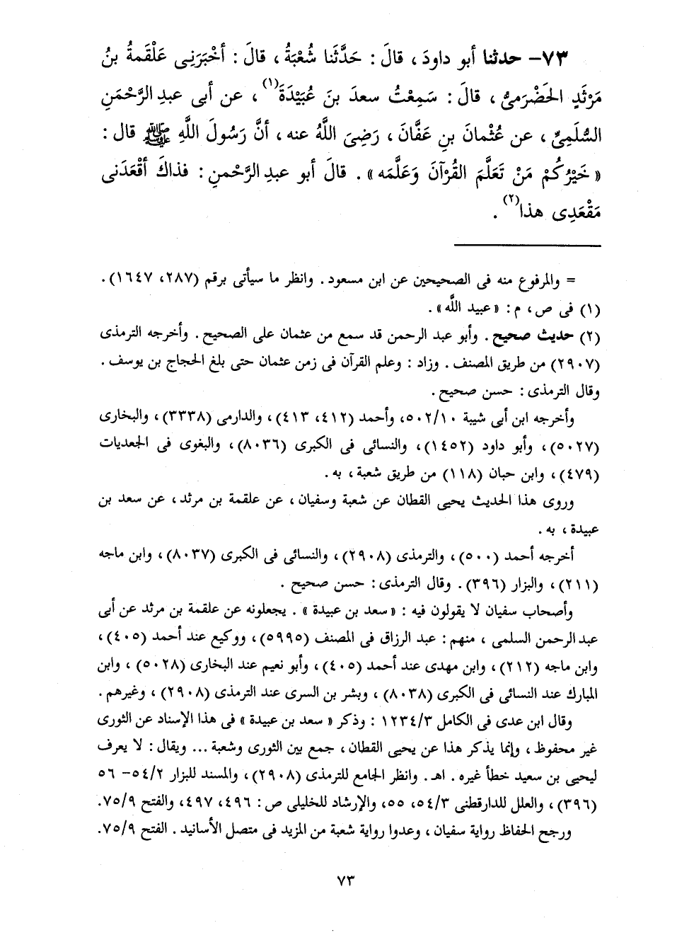73 - حَدَّثَنَا أَبُو دَاوُدَ قَالَ: حَدَّثَنَا شُعْبَةُ، قَالَ: أَخْبَرَنِي عَلْقَمَةُ بْنُ مَرْثَدٍ الْحَضْرَمِيُّ، قَالَ: سَمِعْتُ سَعْدَ بْنَ عُبَيْدَةَ، عَنْ أَبِي عَبْدِ الرَّحْمَنِ السُّلَمِيِّ، عَنْ عُثْمَانَ بْنِ عَفَّانَ رَضِيَ اللَّهُ عَنْهُ، أَنَّ رَسُولَ اللَّهِ صَلَّى اللهُ عَلَيْهِ وَسَلَّمَ قَالَ: «§خَيْرُكُمْ مَنْ تَعَلَّمَ الْقُرْآنَ وَعَلَّمَهُ» ، قَالَ أَبُو عَبْدِ الرَّحْمَنِ: فَذَاكَ أَقْعَدَنِي مَقْعَدِي هَذَا