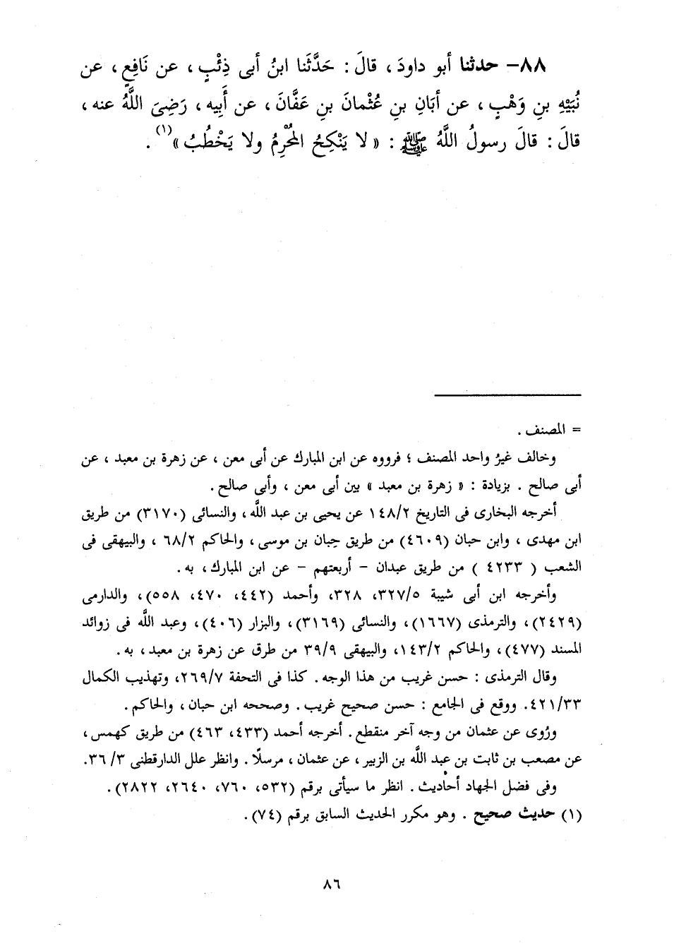 88 - حَدَّثَنَا أَبُو دَاوُدَ قَالَ: حَدَّثَنَا ابْنُ أَبِي ذِئْبٍ، عَنْ نَافِعٍ، عَنْ نُبَيْهِ بْنِ وَهْبٍ، عَنْ أَبَانَ بْنِ عُثْمَانَ بْنِ عَفَّانَ، عَنْ أَبِيهِ، رَضِيَ اللَّهُ عَنْهُ قَالَ: قَالَ رَسُولُ اللَّهِ صَلَّى اللهُ عَلَيْهِ وَسَلَّمَ: «§لَا يَنْكِحُ الْمُحْرِمُ وَلَا يَخْطُبُ»
