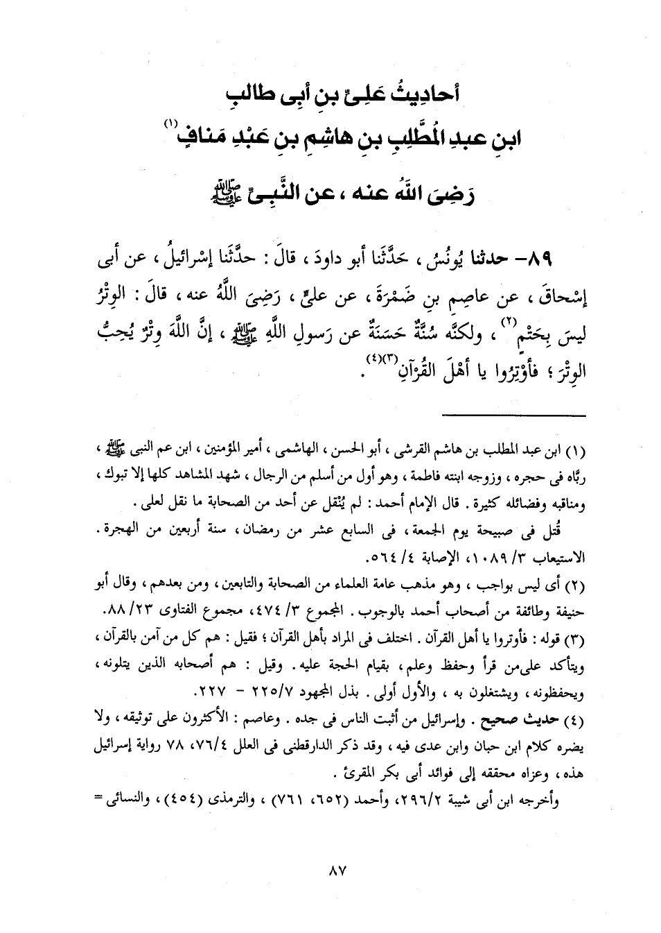 89 - حَدَّثَنَا يُونُسُ، حَدَّثَنَا أَبُو دَاوُدَ قَالَ: حَدَّثَنَا إِسْرَائِيلُ، عَنْ أَبِي إِسْحَاقَ، عَنْ عَاصِمِ بْنِ ضَمْرَةَ، عَنْ عَلِيٍّ رَضِيَ اللَّهُ عَنْهُ، قَالَ: «§الْوِتْرُ لَيْسَ بِحَتْمٍ وَلَكِنَّهُ سُنَّةٌ حَسَنَةٌ عَنْ رَسُولِ اللَّهِ صَلَّى اللهُ عَلَيْهِ وَسَلَّمَ، إِنَّ اللَّهَ وِتْرٌ يُحِبُّ الْوِتْرَ فَأَوْتِرُوا يَا أَهْلَ الْقُرْآنِ»