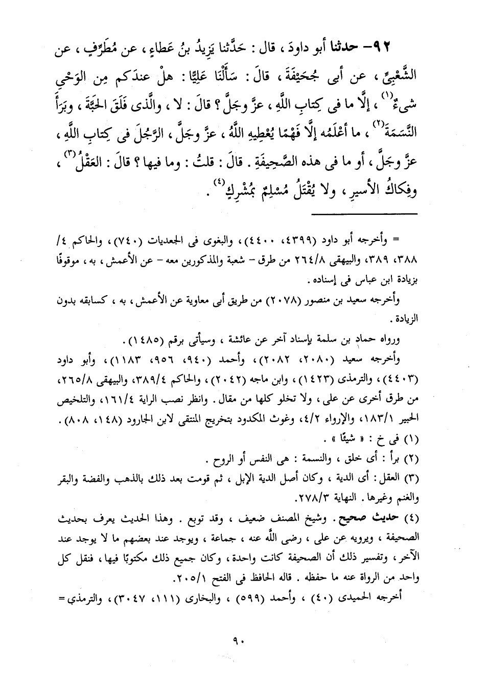 92 - حَدَّثَنَا أَبُو دَاوُدَ قَالَ: حَدَّثَنَا يَزِيدُ بْنُ عَطَاءٍ، عَنْ مُطَرِّفٍ، عَنِ الشَّعْبِيِّ، عَنْ أَبِي جُحَيْفَةَ، قَالَ: سَأَلْنَا عَلِيًّا: §هَلْ عِنْدَكُمْ مِنَ الْوَحْيِ شَيْءٌ إِلَّا مَا فِي كِتَابِ اللَّهِ عَزَّ وَجَلَّ؟ قَالَ: «لَا وَالَّذِي فَلَقَ الْحَبَّةَ وَبَرَأَ النَّسَمَةَ مَا أَعْلَمُهُ إِلَّا فَهْمًا يُعْطِيهِ اللَّهُ عَزَّ وَجَلَّ الرَّجُلَ فِي كِتَابِ اللَّهِ عَزَّ وَجَلَّ أَوْ مَا فِي هَذِهِ الصَّحِيفَةِ» قَالَ: قُلْتُ: وَمَا فِيهَا؟ قَالَ: «الْعَقْلُ وَفِكَاكُ الْأَسِيرِ وَلَا يُقْتَلُ مُسْلِمٌ بِمُشْرِكٍ»