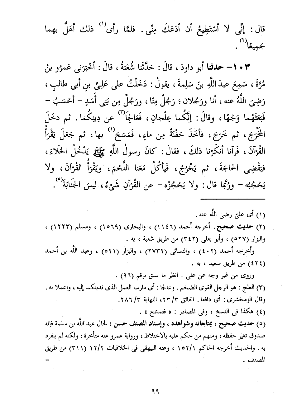 103 - حَدَّثَنَا أَبُو دَاوُدَ قَالَ: حَدَّثَنَا شُعْبَةُ قَالَ: أَخْبَرَنِي عَمْرُو بْنُ مُرَّةَ، سَمِعَ عَبْدَ اللَّهِ بْنَ سَلَمَةَ، يَقُولُ: دَخَلْتُ عَلَى عَلِيِّ بْنِ أَبِي طَالِبٍ رَضِيَ اللَّهُ عَنْهُ أَنَا وَرَجُلَانُ، رَجُلٌ مِنَّا وَرَجُلٌ مِنْ بَنِي أَسَدٍ أَحْسَبُ فَبَعَثَهُمَا وَجْهًا وَقَالَ: إِنَّكُمَا عِلْجَانِ فَعَالِجَا عَنْ دِينِكُمَا ثُمَّ دَخَلَ الْمَخْرَجَ ثُمَّ خَرَجَ فَأَخَذَ حَفْنَةً مِنْ مَاءٍ فَمَسَحَ بِهَا ثُمَّ جَعَلَ يَقْرَأُ الْقُرْآنَ فَرَآنَا أَنْكَرْنَا ذَلِكَ فَقَالَ: «§كَانَ رَسُولُ اللَّهِ صَلَّى اللهُ عَلَيْهِ وَسَلَّمَ يَدْخُلُ الْخَلَاءَ فَيَقْضِي الْحَاجَةَ ثُمَّ يَخْرُجُ، فَيَأْكُلُ مَعَنِا اللَّحْمَ وَيَقْرَأُ الْقُرْآنَ وَلَا يَحْجُبُهُ - وَرُبَّمَا قَالَ - وَلَا يَحْجُزُهُ عَنِ الْقُرْآنِ شَيْءٌ لَيْسَ الْجَنَابَةَ»