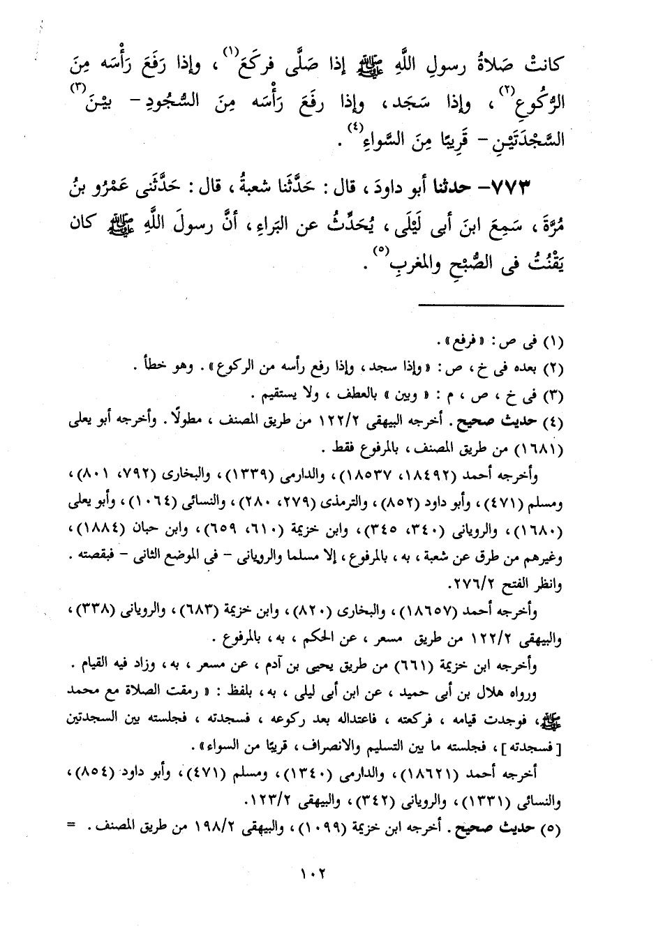 773 - حَدَّثَنَا أَبُو دَاوُدَ قَالَ: حَدَّثَنَا شُعْبَةُ، قَالَ: حَدَّثَنِي عَمْرُو بْنُ مُرَّةَ، سَمِعَ ابْنَ أَبِي لَيْلَى، يُحَدِّثُ عَنِ الْبَرَاءِ، أَنَّ رَسُولَ اللَّهِ صَلَّى اللهُ عَلَيْهِ وَسَلَّمَ «§كَانَ يَقْنُتُ فِي الصُّبْحِ وَالْمَغْرِبِ»