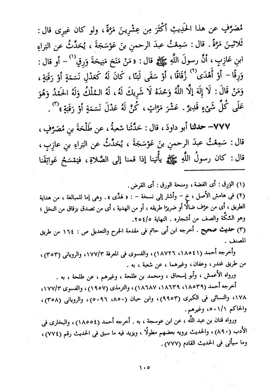 777 - حَدَّثَنَا أَبُو دَاوُدَ قَالَ: حَدَّثَنَا شُعْبَةُ، عَنْ طَلْحَةَ بْنِ مُصَرِّفٍ، قَالَ: سَمِعْتُ عَبْدَ الرَّحْمَنِ بْنَ عَوْسَجَةَ، يُحَدِّثُ عَنِ الْبَرَاءِ بْنِ عَازِبٍ، قَالَ: كَانَ رَسُولُ اللَّهِ صَلَّى اللهُ عَلَيْهِ وَسَلَّمَ يَأْتِينَا إِذَا قُمْنَا إِلَى الصَّلَاةِ فَيَمْسَحُ عَوَاتِقَنَا -[106]- وَصُدُورَنَا وَيَقُولُ: «§لَا تَخْتَلِفُوا فَتَخْتَلِفَ قُلُوبُكُمْ، إِنَّ اللَّهَ عَزَّ وَجَلَّ وَمَلَائِكَتَهُ يُصَلُّونَ عَلَى الصَّفِّ الْأَوَّلِ» أَوْ قَالَ: «الصُّفُوفِ الْأُوَلِ»