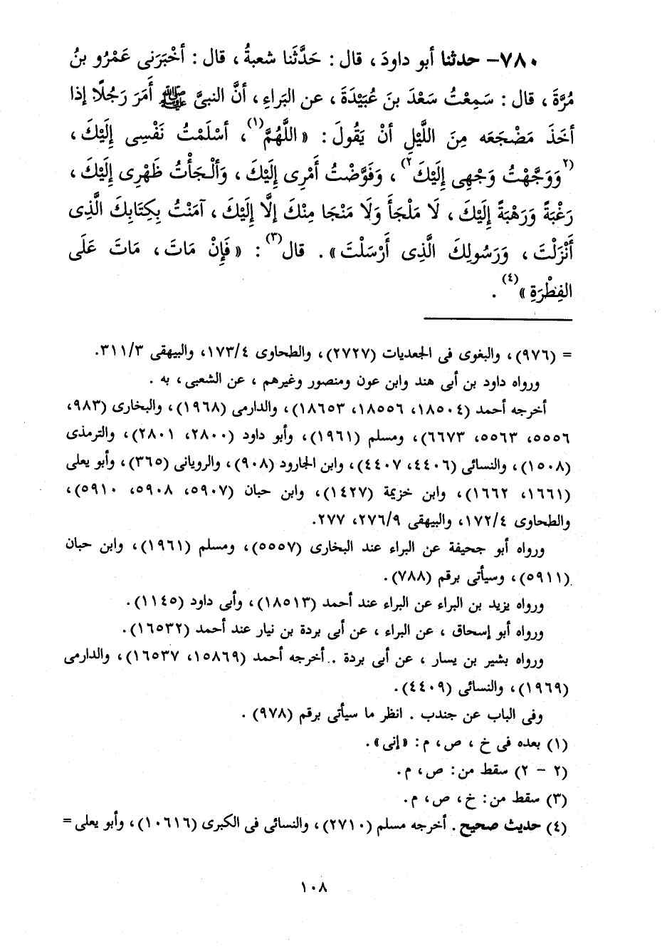 780 - حَدَّثَنَا أَبُو دَاوُدَ قَالَ: حَدَّثَنَا شُعْبَةُ، قَالَ: أَخْبَرَنِي عَمْرُو بْنُ مُرَّةَ، قَالَ: سَمِعْتُ سَعْدَ بْنَ عُبَيْدَةَ، عَنِ الْبَرَاءِ، أَنَّ النَّبِيَّ صَلَّى اللهُ عَلَيْهِ وَسَلَّمَ أَمَرَ رَجُلًا إِذَا أَخَذَ مَضْجَعَهُ مِنَ اللَّيْلِ أَنْ يَقُولَ: «§اللَّهُمَّ أَسْلَمْتُ نَفْسِي إِلَيْكَ، وَوَجَّهْتُ وَجْهِي إِلَيْكَ، وَفَوَّضْتُ أَمْرِي إِلَيْكَ، وَأَلْجَأْتُ ظَهْرِي إِلَيْكَ رَغْبَةً وَرَهْبَةً إِلَيْكَ، لَا مَلْجَأَ وَلَا مَنْجَا مِنْكَ إِلَّا إِلَيْكَ، آمَنْتُ بِكِتَابِكَ الَّذِي أَنْزَلْتَ وَرَسُولِكَ الَّذِي أَرْسَلْتَ» قَالَ: «فَإِنْ مَاتَ مَاتَ عَلَى الْفِطْرَةِ»