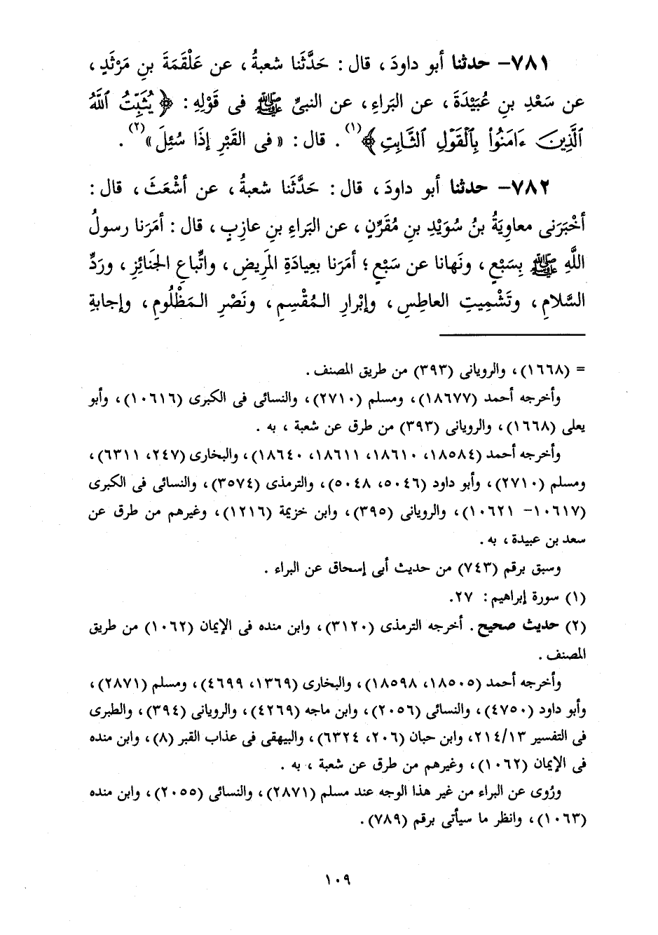 781 - حَدَّثَنَا أَبُو دَاوُدَ قَالَ: حَدَّثَنَا شُعْبَةُ، عَنْ عَلْقَمَةَ بْنِ مَرْثَدٍ، عَنْ سَعْدِ بْنِ عُبَيْدَةَ، عَنِ الْبَرَاءِ، عَنِ النَّبِيِّ صَلَّى اللهُ عَلَيْهِ وَسَلَّمَ فِي قَوْلِهِ {§يُثَبِّتُ اللَّهُ الَّذِينَ آمَنُوا بِالْقَوْلِ الثَّابِتِ} [إبراهيم: 27] قَالَ: «فِي الْقَبْرِ إِذَا سُئِلَ»