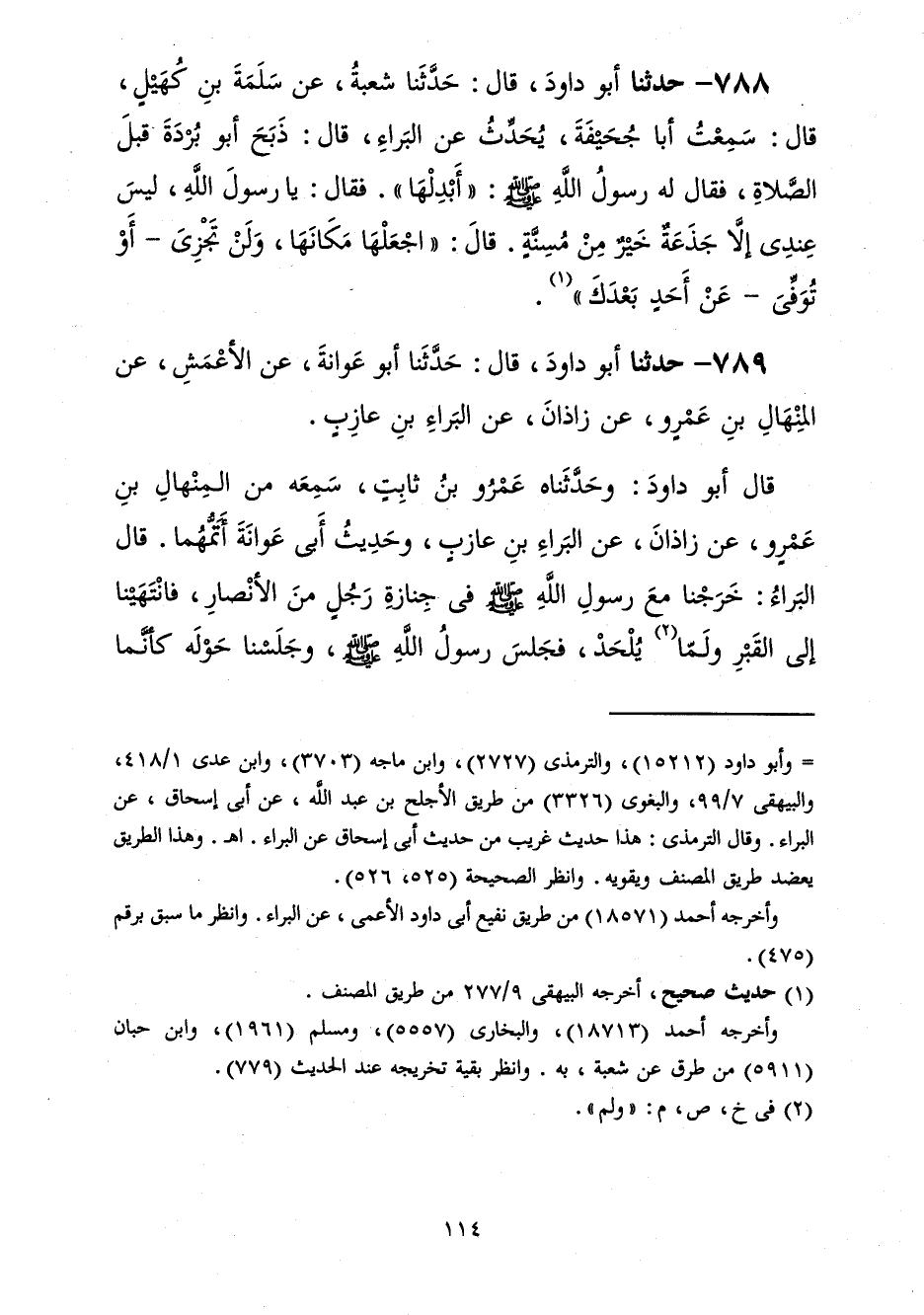 789 - حَدَّثَنَا أَبُو دَاوُدَ قَالَ: حَدَّثَنَا أَبُو عَوَانَةَ، عَنِ الْأَعْمَشِ، عَنِ الْمِنْهَالِ بْنِ عَمْرٍو، عَنْ زَاذَانَ، عَنِ الْبَرَاءِ بْنِ عَازِبٍ، قَالَ أَبُو دَاوُدَ وَحَدَّثَنَاهُ عَمْرُو بْنُ ثَابِتٍ، سَمِعَهُ مِنَ الْمِنْهَالِ بْنِ عَمْرٍو، عَنْ زَاذَانَ، عَنِ الْبَرَاءِ بْنِ عَازِبٍ، وَحَدِيثُ أَبِي عَوَانَةَ، أَتَمُّهُمَا قَالَ الْبَرَاءُ: خَرَجْنَا مَعَ رَسُولِ اللَّهِ صَلَّى اللهُ عَلَيْهِ وَسَلَّمَ فِي جِنَازَةِ رَجُلٍ مِنَ الْأَنْصَارِ فَانْتَهَيْنَا إِلَى الْقَبْرِ وَلَمَّا يُلْحَدْ فَجَلَسَ رَسُولُ اللَّهِ صَلَّى اللهُ عَلَيْهِ وَسَلَّمَ وَجَلَسْنَا حَوْلَهُ كَأَنَّمَا -[115]- عَلَى رُءُوسِنَا الطَّيْرُ - قَالَ عَمْرُو بْنُ ثَابِتٍ: وُقَّعٌ وَلَمْ يَقُلْهُ أَبُو عَوَانَةَ - فَجَعَلَ يَرْفَعُ بَصَرَهُ وَيَنْظُرُ إِلَى السَّمَاءِ وَيَخْفِضُ بَصَرَهُ وَيَنْظُرُ إِلَى الْأَرْضِ ثُمَّ قَالَ: «أَعُوذُ بِاللَّهِ مِنْ عَذَابِ الْقَبْرِ» قَالَهَا مِرَارًا ثُمَّ قَالَ: " إِنَّ §الْعَبْدَ الْمُؤْمِنَ إِذَا كَانَ فِي قُبُلٍ مِنَ الْآخِرَةِ وَانْقِطَاعٍ مِنَ الدُّنْيَا جَاءَهُ مَلَكٌ فَجَلَسَ عِنْدَ رَأْسِهِ فَيَقُولُ: اخْرُجِي أَيَّتُهَا النَّفْسُ الْمُطْمَئِنَّةُ إِلَى مَغْفِرَةٍ مِنَ اللَّهِ وَرِضْوَانٍ فَتَخْرُجُ نَفْسُهُ وَتَسِيلُ كَمَا يَسِيلُ قَطْرُ السِّقَاءِ " قَالَ عَمْرٌو فِي حَدِيثِهِ وَلَمْ يَقُلْهِ أَبُو عَوَانَةَ: " وَإِنْ كُنْتُمْ تَرَوْنَ غَيْرَ ذَلِكَ وَتَنْزِلُ مَلَائِكَةٌ مِنَ الْجَنَّةِ بِيضُ الْوُجُوهِ كَأَنَّ وُجُوهَهُمُ الشَّمْسُ مَعَهُمْ أَكْفَانٌ مِنْ أَكْفَانِ الْجَنَّةِ وَحَنُوطٌ مِنْ حَنُوطِهَا فَيَجْلِسُونَ مِنْهُ مَدَّ الْبَصَرِ فَإِذَا قَبَضَهَا الْمَلَكُ لَمْ يَدَعُوهَا فِي يَدِهِ طَرْفَةَ عَيْنٍ فَذَلِكَ قَوْلُهُ عَزَّ وَجَلَّ {تَوَفَّتْهُ رُسُلُنَا وَهُمْ لَا يُفَرِّطُونَ} [الأنعام: 61] " قَالَ: " فَتَخْرُجُ نَفْسُهُ كَأَطْيَبِ رِيحٍ وُجِدَتْ فَتَعْرُجُ بِهِ الْمَلَائِكَةُ فَلَا -[116]- يَأْتُونَ عَلَى جُنْدٍ بَيْنَ السَّمَاءِ وَالْأَرْضِ إِلَّا قَالُوا: مَا هَذَا الرُّوحُ؟ فَيُقَالُ: فُلَانٌ، بِأَحْسَنِ أَسْمَائِهِ حَتَّى يَنْتَهُوا بِهِ إِلَى بَابِ سَمَاءِ الدُّنْيَا فَيُفْتَحُ لَهُ وَيُشَيِّعُهُ مِنْ كُلِّ سَمَاءٍ مُقَرَّبُوهَا حَتَّى يُنْتَهَى بِهَا إِلَى السَّمَاءِ السَّابِعَةِ فَيَقُولُ: اكْتُبُوا كِتَابَهُ فِي عِلِّيِّينَ {وَمَا أَدْرَاكَ مَا عِلِّيُونَ كِتَابٌ مَرْقُومٌ يَشْهَدُهُ الْمُقَرَّبُونَ} [المطففين: 20] فَيُكْتَبُ كِتَابُهُ فِي عِلِّيِّينَ ثُمَّ يُقَالُ: رُدُّوهُ إِلَى الْأَرْضِ فَإِنِّي وَعَدْتُهُمْ أَنِّي مِنْهَا خَلَقْتُهُمْ وَفِيهَا نُعِيدُهُمْ وَمِنْهَا نُخْرِجُهُمْ تَارَةً أُخْرَى فَيُرَدُّ إِلَى الْأَرْضِ وَتُعَادُ رُوحُهُ فِي جَسَدِهِ فَيَأْتِيهِ مَلَكَانِ شَدِيدَا الِانْتِهَارِ فَيَنْتَهِرَانِهِ وَيُجْلِسَانِهِ فَيَقُولَانِ: مَنْ رَبُّكَ؟ وَمَا دِينُكَ؟ فَيَقُولُ: رَبِّيَ اللَّهُ وَدِينِيَ الْإِسْلَامُ فَيَقُولَانِ: فَمَا تَقُولُ فِي هَذَا الرَّجُلِ الَّذِي بُعِثَ فِيكُمْ؟ فَيَقُولُ: هُوَ رَسُولُ اللَّهِ فَيَقُولَانِ وَمَا يُدْرِيكَ؟ فَيَقُولُ: جَاءَنَا بِالْبَيِّنَاتِ مِنْ رَبِّنَا فَآمَنْتُ بِهِ وَصَدَّقْتُهُ " قَالَ: " وَذَلِكَ قَوْلُهُ عَزَّ وَجَلَّ: {يُثَبِّتُ اللَّهُ الَّذِينَ آمَنُوا بِالْقَوْلِ الثَّابِتِ فِي الْحَيَاةِ الدُّنْيَا وَفِي الْآخِرَةِ} [إبراهيم: 27] " قَالَ: " وَيُنَادِي مُنَادٍ مِنَ السَّمَاءِ أَنْ قَدْ صَدَقَ عَبْدِي فَأَلْبِسُوهُ مِنَ الْجَنَّةِ وَأَفْرِشُوهُ مِنْهَا وَأَرُوهُ مَنْزِلَهُ مِنْهَا فَيَلْبِسُ مِنَ الْجَنَّةِ وَيُفْرَشُ مِنْهَا وَيَرَى مَنْزِلَهُ مِنْهَا وَ