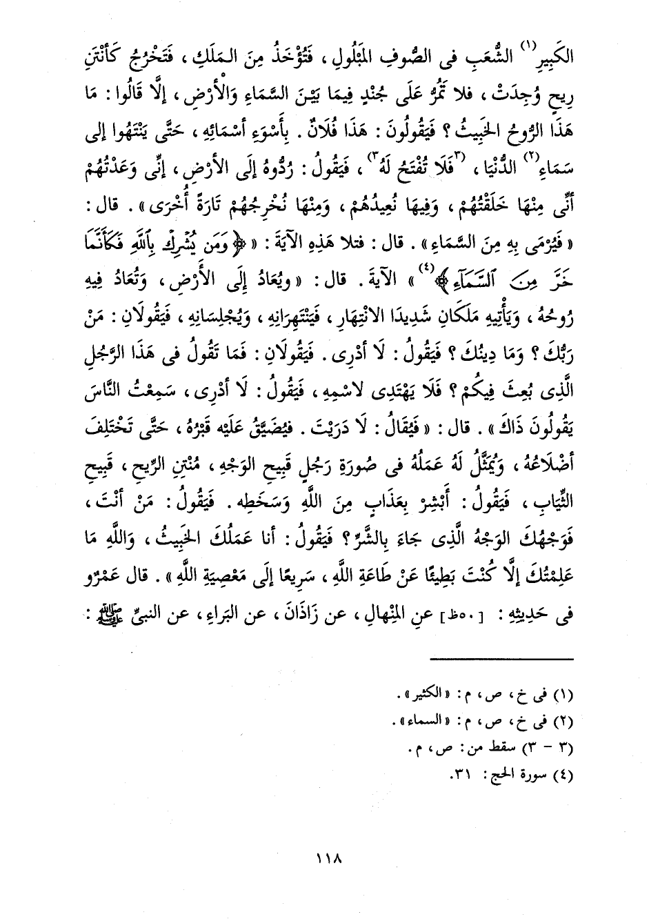 قَالَ: فَتَلاَ هَذِهِ الآيَةَ: {وَمَنْ يُشْرِكْ بِاللهِ فَكَأَنَّمَا خَرَّ مِنَ السَّمَاءِ} الآيَةَ، قَالَ: وَيُعَادُ إِلَى الأَرْضِ وَتُعَادُ فِيهِ رُوحُهُ وَيَأْتِيهِ مَلَكَانِ شَدِيدَا الاِنْتِهَارِ فَيَنْتَهِرَانِهِ وَيُجْلِسَانِهِ فَيَقُولاَنِ مَنْ رَبُّكَ؟ وَمَا دِينُكَ؟ فَيَقُولُ: لاَ أَدْرِي، فَيَقُولاَنِ: فَمَا تَقُولُ فِي هَذَا الرَّجُلِ الَّذِي بُعِثَ فِيكُمْ؟ فَلاَ يَهْتَدِي لاِسْمِهِ، فَيَقُولُ: لاَ أَدْرِي سَمِعْتُ النَّاسَ يَقُولُونَ ذَاكَ، قَالَ: فَيُقَالَ: لاَ دَرَيْتَ، فَيُضَيَّقُ عَلَيْهِ قَبْرُهُ حَتَّى تَخْتَلِفَ أَضْلاَعُهُ وَيُمَثَّلُ لَهُ عَمَلُهُ فِي صُورَةِ رَجُلٍ قَبِيحِ الْوَجْهِ مُنْتِنِ الرِّيحِ قَبِيحِ الثِّيَابِ، فَيَقُولُ: أَبْشِرْ بِعَذَابٍ مِنَ اللهِ وَسَخَطِهِ، فَيَقُولُ: مَنْ أَنْتَ فَوَجْهُكَ الْوَجْهُ الَّذِي جَاءَ بِالشَّرِّ؟ فَيَقُولُ: أَنَا عَمَلُكَ الْخَبِيثُ وَاللهِ مَا عَلِمْتُكَ إِلاَّ كُنْتَ بَطِيئًا عَنْ طَاعَةِ اللهِ سَرِيعًا إِلَى مَعْصِيَةِ اللهِ.