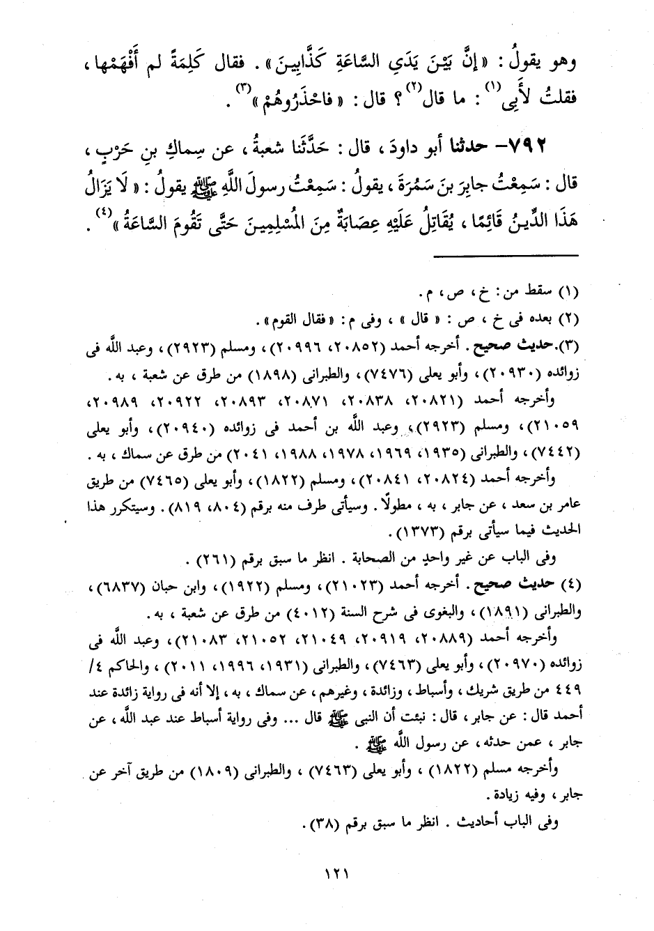 792 - حَدَّثَنَا أَبُو دَاوُدَ قَالَ: حَدَّثَنَا شُعْبَةُ، عَنْ سِمَاكِ بْنِ حَرْبٍ، قَالَ: سَمِعْتُ جَابِرَ بْنَ سَمُرَةَ، يَقُولُ: سَمِعْتُ رَسُولَ اللَّهِ صَلَّى اللهُ عَلَيْهِ وَسَلَّمَ يَقُولُ: «§لَا يَزَالُ هَذَا الدِّينُ قَائِمًا يُقَاتِلُ عَلَيْهِ عِصَابَةٌ مِنَ الْمُسْلِمِينَ حَتَّى تَقُومَ السَّاعَةُ»