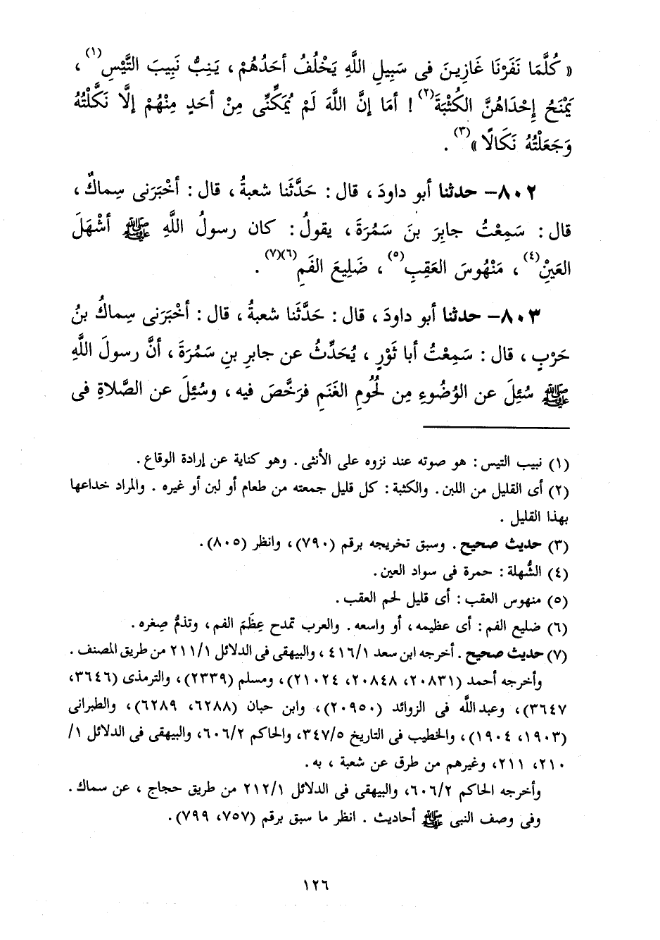 802 - حَدَّثَنَا أَبُو دَاوُدَ قَالَ: حَدَّثَنَا شُعْبَةُ، قَالَ: أَخْبَرَنِي سِمَاكٌ، قَالَ: سَمِعْتُ جَابِرَ بْنَ سَمُرَةَ، يَقُولُ: «كَانَ §رَسُولُ اللَّهِ صَلَّى اللهُ عَلَيْهِ وَسَلَّمَ أَشْهَلَ الْعَيْنِ مَنْهُوسَ الْعَقِبِ ضَلِيعَ الْفَمِ»