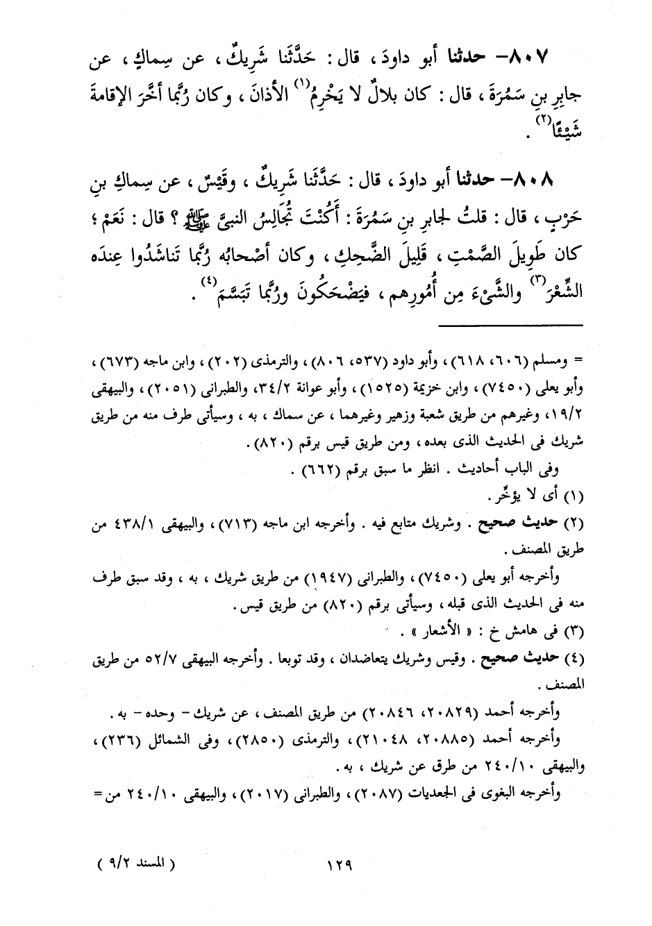 808 - حَدَّثَنَا أَبُو دَاوُدَ قَالَ: حَدَّثَنَا شَرِيكٌ، وَقَيْسٌ، عَنْ سِمَاكِ بْنِ حَرْبٍ، قَالَ: قُلْتُ لِجَابِرِ بْنِ سَمُرَةَ: أَكُنْتَ تُجَالِسُ النَّبِيَّ صَلَّى اللهُ عَلَيْهِ وَسَلَّمَ؟ قَالَ: نَعَمْ، «§كَانَ طَوِيلَ الصَّمْتِ قَلِيلَ الضَّحِكِ وَكَانَ أَصْحَابُهُ رُبَّمَا تَنُاشَدُوا عِنْدَهُ الشِّعْرَ وَالشَّيْءَ مِنْ أُمُورِهِمْ فَيَضْحَكُونَ وَرُبَّمَا تَبَسَّمَ»