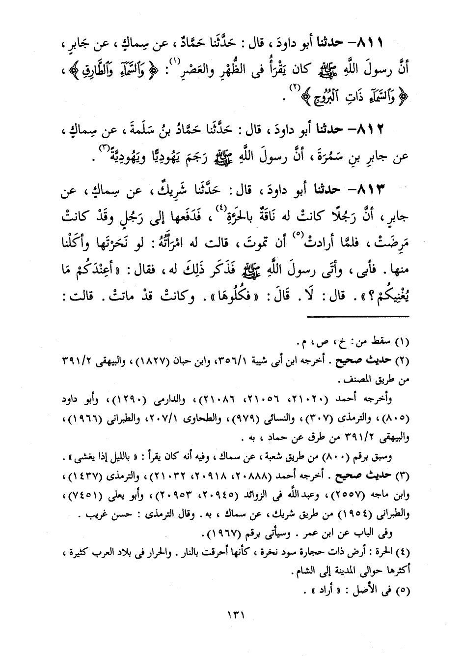 811 - حَدَّثَنَا أَبُو دَاوُدَ قَالَ: حَدَّثَنَا حَمَّادٌ، عَنْ سِمَاكٍ، عَنْ جَابِرٍ، أَنَّ رَسُولَ اللَّهِ صَلَّى اللهُ عَلَيْهِ وَسَلَّمَ «كَانَ §يَقْرَأُ فِي الظُّهْرِ وَالْعَصْرِ وَالسَّمَاءِ وَالطَّارِقِ وَالسَّمَاءِ ذَاتِ الْبُرُوجِ»