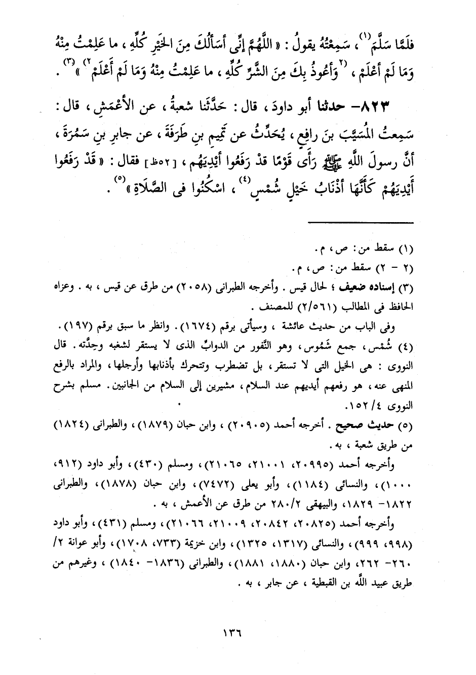823 - حَدَّثَنَا أَبُو دَاوُدَ قَالَ: حَدَّثَنَا شُعْبَةُ، عَنِ الْأَعْمَشِ، قَالَ: سَمِعْتُ الْمُسَيَّبَ بْنَ رَافِعٍ، يُحَدِّثُ عَنْ تَمِيمِ بْنِ طَرَفَةَ، عَنْ جَابِرِ بْنِ سَمُرَةَ، أَنَّ رَسُولَ اللَّهِ صَلَّى اللهُ عَلَيْهِ وَسَلَّمَ رَأَى قَوْمًا قَدْ رَفَعُوا أَيْدِيَهُمْ فَقَالَ: «قَدْ §رَفَعُوا أَيْدِيَهُمْ كَأَنَّهَا أَذْنَابُ خَيْلٍ شُمْسٍ اسْكُنُوا فِي الصَّلَاةِ»