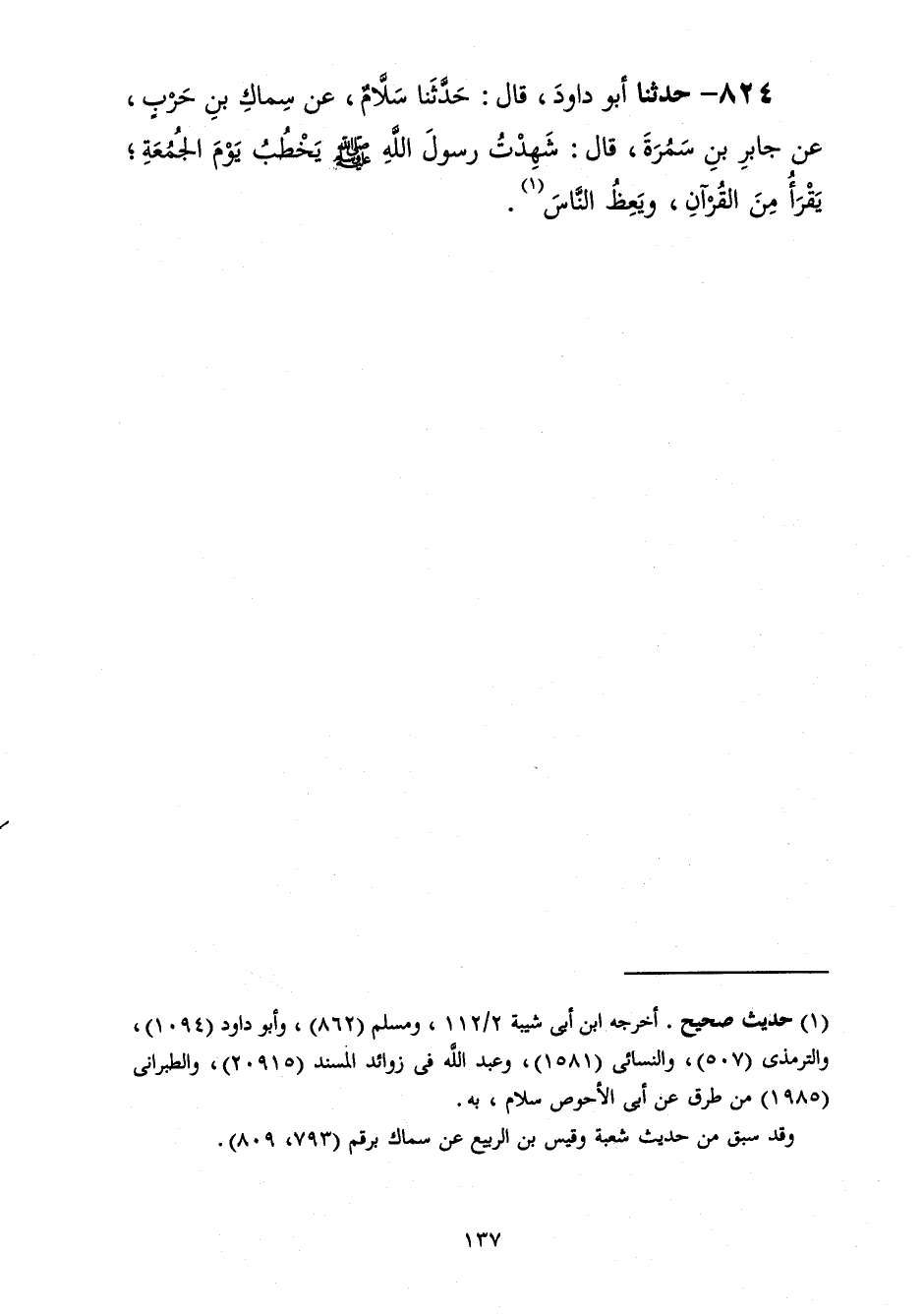 824 - حَدَّثَنَا أَبُو دَاوُدَ قَالَ: حَدَّثَنَا سَلَّامٌ، عَنْ سِمَاكِ بْنِ حَرْبٍ، عَنْ جَابِرِ بْنِ سَمُرَةَ، قَالَ: «شَهِدْتُ رَسُولَ اللَّهِ صَلَّى اللهُ عَلَيْهِ وَسَلَّمَ §يَخْطُبُ يَوْمَ الْجُمُعَةِ يَقْرَأُ مِنَ الْقُرْآنِ وَيَعِظُ النَّاسَ»
