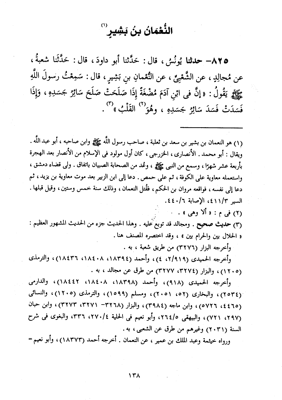 825 - حَدَّثَنَا يُونُسُ قَالَ: حَدَّثَنَا أَبُو دَاوُدَ قَالَ: حَدَّثَنَا شُعْبَةُ، عَنْ مُجَالِدٍ، عَنِ الشَّعْبِيِّ، عَنِ النُّعْمَانِ بْنِ بَشِيرٍ، قَالَ: سَمِعْتُ رَسُولَ اللَّهِ صَلَّى اللهُ عَلَيْهِ وَسَلَّمَ يَقُولُ: «إِنَّ §فِي ابْنِ آدَمَ مُضْغَةً إِذَا صَلُحَتْ صَلُحَ سَائِرُ جَسَدِهِ وَإِذَا فَسَدَتْ فَسَدَ سَائِرُ جَسَدِهِ وَهُوَ الْقَلْبُ»