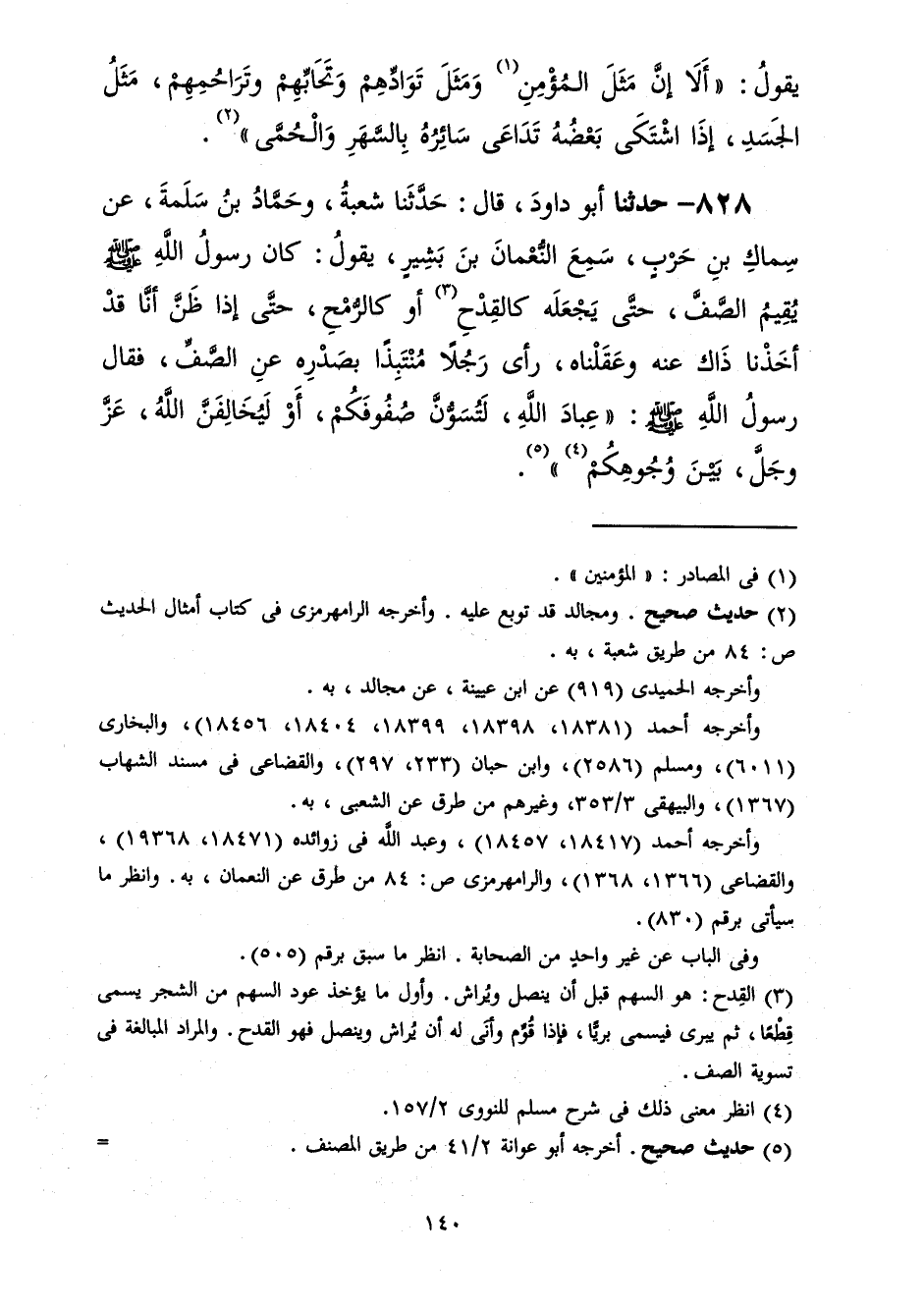 828 - حَدَّثَنَا أَبُو دَاوُدَ قَالَ: حَدَّثَنَا شُعْبَةُ، وَحَمَّادُ بْنُ سَلَمَةَ، عَنْ سِمَاكِ بْنِ حَرْبٍ، سَمِعَ النُّعْمَانَ بْنَ بَشِيرٍ، يَقُولُ: كَانَ رَسُولُ اللَّهِ صَلَّى اللهُ عَلَيْهِ وَسَلَّمَ يُقِيمُ الصَّفَّ حَتَّى يَجْعَلَهُ كَالْقَدَحِ أَوْ كَالرُّمْحِ حَتَّى إِذَا ظَنَّ أَنَّا قَدْ أَخَذْنَا ذَاكَ عَنْهُ وَعَقِلْنَاهُ رَأَى رَجُلًا مُنْتَبِذًا بِصَدْرِهِ عَنِ الصَّفِّ فَقَالَ رَسُولُ اللَّهِ صَلَّى اللهُ عَلَيْهِ وَسَلَّمَ: «§عِبَادَ اللَّهِ لَتُسَوُّنَّ صُفُوفَكُمْ أَوْ لَيُخَالِفَنَّ اللَّهُ عَزَّ وَجَلَّ بَيْنَ وُجُوهِكُمْ»