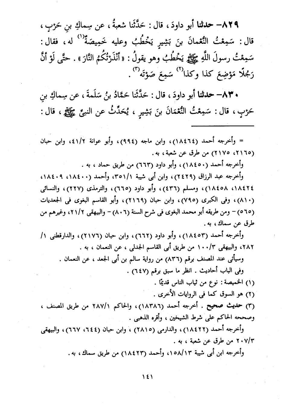 829 - حَدَّثَنَا أَبُو دَاوُدَ قَالَ: حَدَّثَنَا شُعْبَةُ، عَنْ سِمَاكِ بْنِ حَرْبٍ، قَالَ: سَمِعْتُ النُّعْمَانَ بْنَ بَشِيرٍ يَخْطُبُ وَعَلَيْهِ خَمِيصَةٌ لَهُ فَقَالَ: سَمِعْتُ رَسُولَ اللَّهِ صَلَّى اللهُ عَلَيْهِ وَسَلَّمَ يَخْطُبُ وَهُوَ يَقُولُ: «§أَنْذَرْتُكُمُ النَّارَ» حَتَّى لَوْ أَنَّ رَجُلًا مَوْضِعَ كَذَا وَكَذَا سَمِعَ صَوْتَهُ