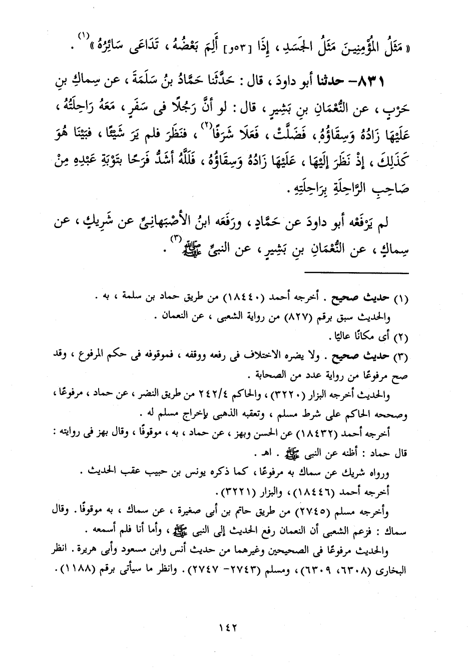 831 - حَدَّثَنَا أَبُو دَاوُدَ قَالَ: حَدَّثَنَا حَمَّادُ بْنُ سَلَمَةَ، عَنْ سِمَاكِ بْنِ حَرْبٍ، عَنِ النُّعْمَانِ بْنِ بَشِيرٍ، قَالَ: «لَوْ أَنَّ رَجُلًا فِي سَفَرٍ مَعَهُ رَاحِلَتُهُ عَلَيْهَا زَادُهُ وَسِقَاؤُهُ فَضَلَّتْ فَعَلَا شَرَفًا فَنَظَرَ فَلَمْ يَرَ شَيْئًا فَبَيْنَا هُوَ كَذَلِكَ إِذْ نَظَرَ إِلَيْهَا عَلَيْهَا زَادُهُ وَسِقَاؤُهُ §فَلَلَّهُ أَشَدُّ فَرَحًا بِتَوْبَةِ عَبْدِهِ مِنْ صَاحِبِ الرَّاحِلَةِ بِرَاحِلَتِهِ» لَمْ يَرْفَعْهُ أَبُو دَاوُدَ عَنْ حَمَّادٍ وَرَفَعَهُ ابْنُ الْأَصْبَهَانِيِّ عَنْ شَرِيكٍ عَنْ سِمَاكٍ عَنِ النُّعْمَانِ بْنِ بَشِيرٍ عَنِ النَّبِيِّ صَلَّى اللهُ عَلَيْهِ وَسَلَّمَ