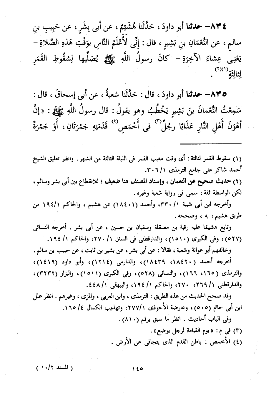 834 - حَدَّثَنَا أَبُو دَاوُدَ قَالَ: حَدَّثَنَا هُشَيْمٌ، عَنْ أَبِي بِشْرٍ، عَنْ حَبِيبِ بْنِ سَالِمٍ، عَنِ النُّعْمَانِ بْنِ بَشِيرٍ، قَالَ: إِنِّي لَأَعْلَمُ النَّاسِ بِوَقْتِ هَذِهِ الصَّلَاةِ يَعْنِي عِشَاءَ الْآخِرَةِ «كَانَ رَسُولُ اللَّهِ صَلَّى اللهُ عَلَيْهِ وَسَلَّمَ §يُصَلِّيهَا لِسُقُوطِ الْقَمَرِ لِثَالِثَةٍ»