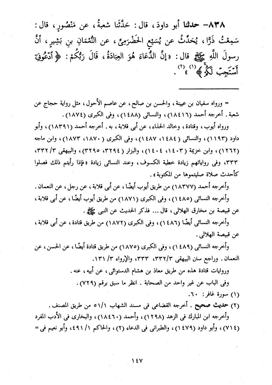 838 - حَدَّثَنَا دَاوُدَ قَالَ: حَدَّثَنَا شُعْبَةُ، عَنْ مَنْصُورٍ، قَالَ: سَمِعْتُ ذَرًّا يُحَدِّثُ عَنْ يُسَيْعٍ الْحَضْرَمِيِّ، عَنِ النُّعْمَانِ بْنِ بَشِيرٍ، أَنَّ رَسُولَ اللَّهِ صَلَّى اللهُ عَلَيْهِ وَسَلَّمَ قَالَ: " إِنَّ §الدُّعَاءَ هُوَ الْعِبَادَةُ قَالَ رَبُّكُمُ: {ادْعُونِي أَسْتَجِبْ لَكُمْ} -[148]-[غافر: 60] "