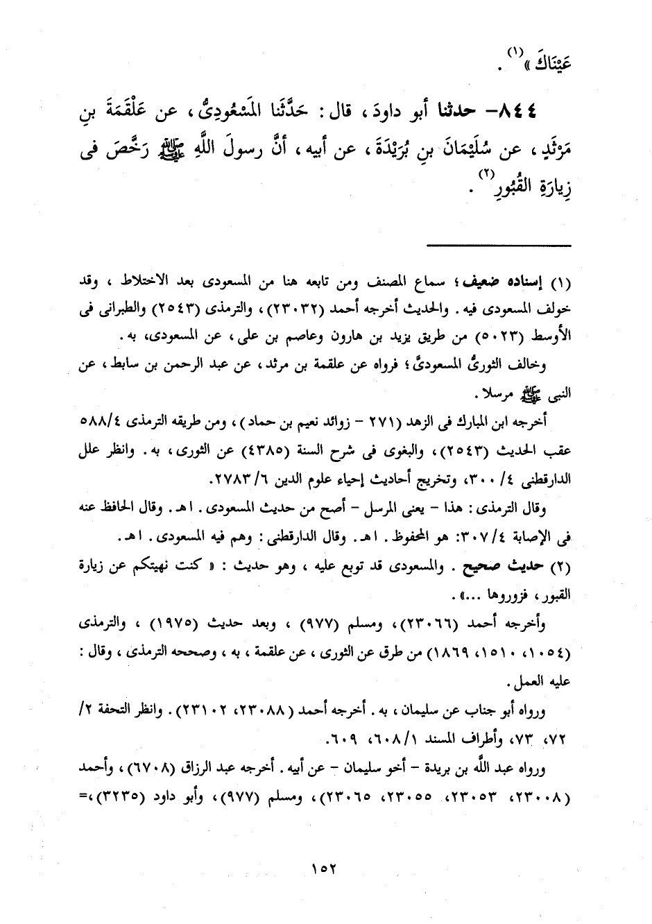 844 - حَدَّثَنَا أَبُو دَاوُدَ قَالَ: حَدَّثَنَا الْمَسْعُودِيُّ، عَنْ عَلْقَمَةَ بْنِ مَرْثَدٍ، عَنْ سُلَيْمَانَ بْنِ بُرَيْدَةَ، عَنْ أَبِيهِ، أَنَّ رَسُولَ اللَّهِ صَلَّى اللهُ عَلَيْهِ وَسَلَّمَ «§رَخَّصَ فِي زِيَارَةِ الْقُبُورِ»