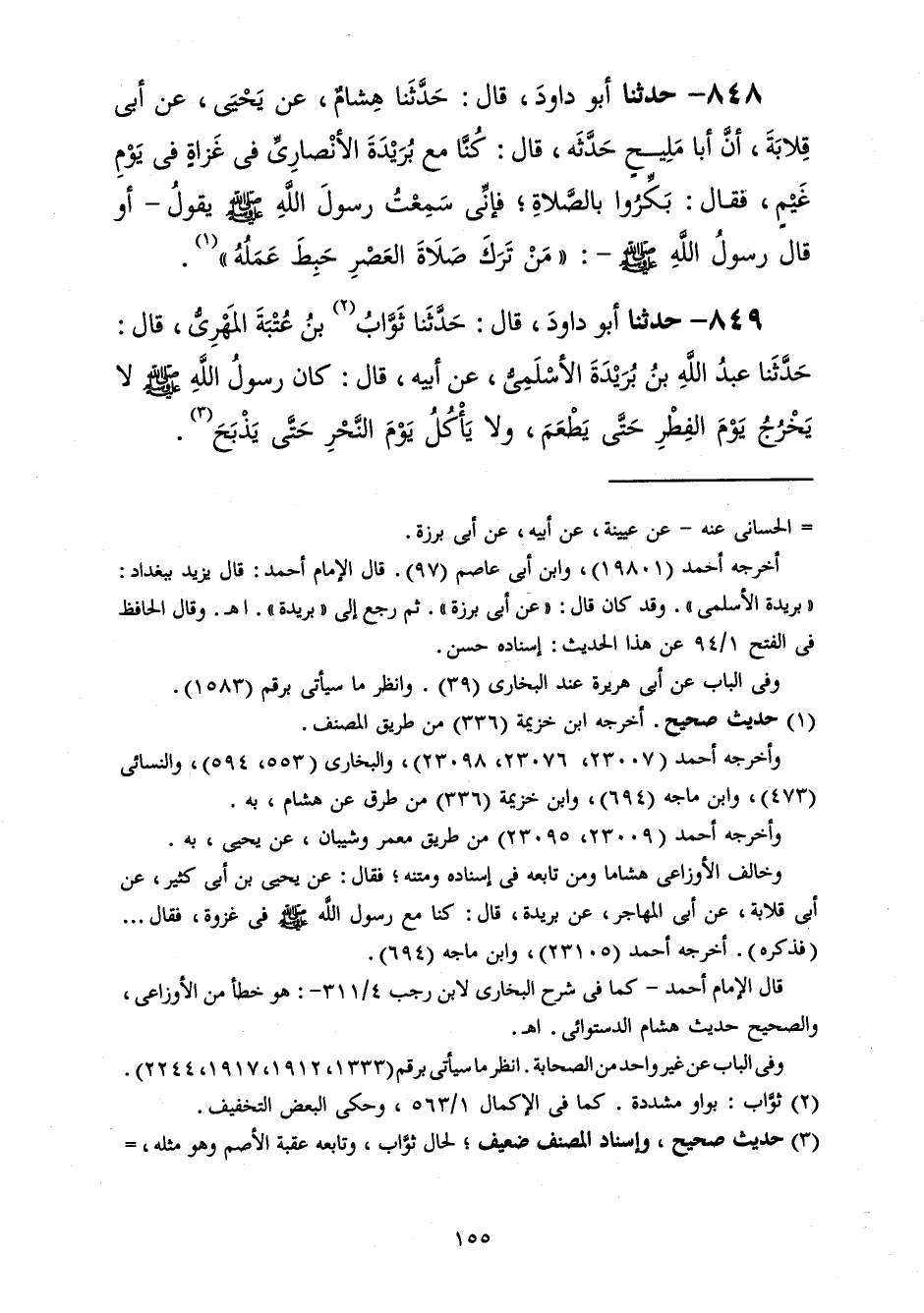 849 - حَدَّثَنَا أَبُو دَاوُدَ قَالَ: حَدَّثَنَا ثَوَّابُ بْنُ عُتْبَةَ الْمَهْرِيُّ، قَالَ: حَدَّثَنَا عَبْدُ اللَّهِ بْنُ بُرَيْدَةَ الْأَسْلَمِيُّ، عَنْ أَبِيهِ، قَالَ: «كَانَ رَسُولُ اللَّهِ صَلَّى اللهُ عَلَيْهِ وَسَلَّمَ §لَا يَخْرُجُ يَوْمَ الْفِطْرِ حَتَّى يَطْعَمَ، وَلَا يَأْكُلُ يَوْمَ النَّحْرِ حَتَّى يَذْبَحَ»