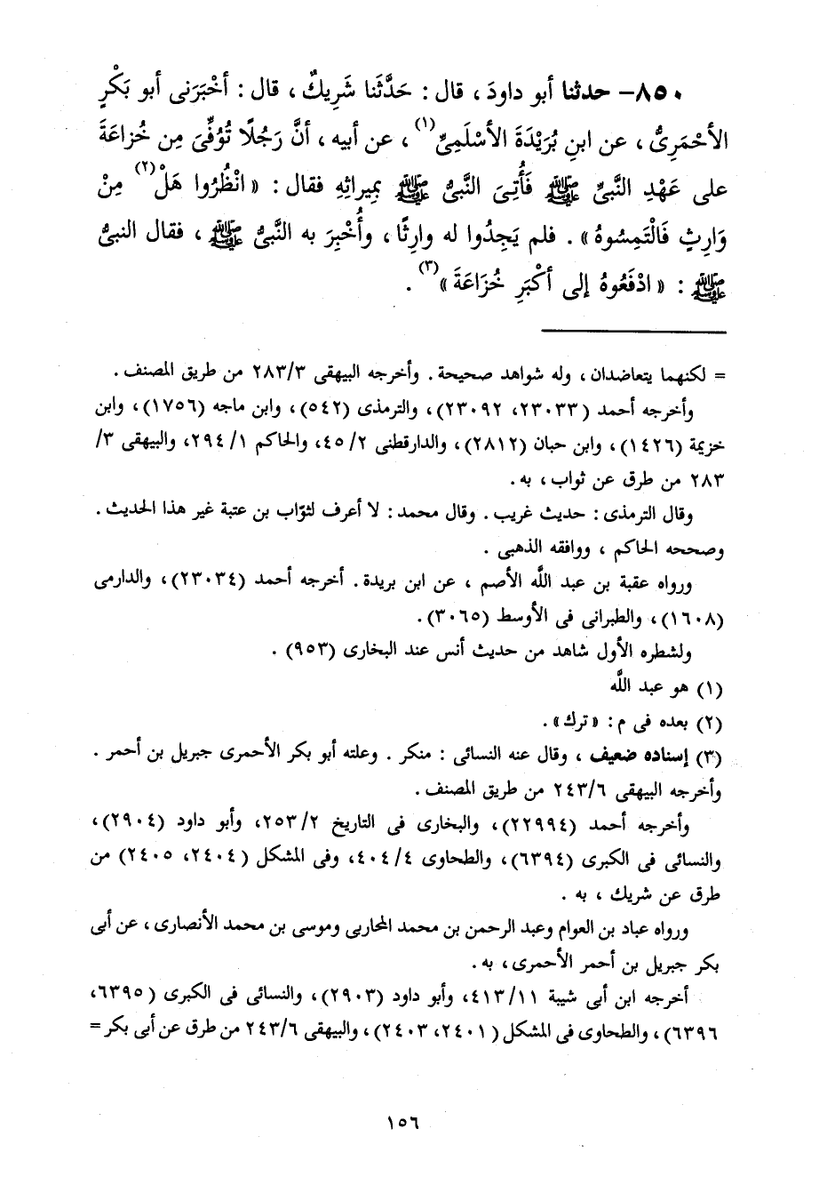 850 - حَدَّثَنَا أَبُو دَاوُدَ قَالَ: حَدَّثَنَا شَرِيكٌ، قَالَ: أَخْبَرَنِي أَبُو بَكْرٍ الْأَحْمَرِيُّ، عَنِ ابْنِ بُرَيْدَةَ الْأَسْلَمِيِّ، عَنْ أَبِيهِ، أَنَّ رَجُلًا تُوُفِّيَ مِنْ خُزَاعَةَ عَلَى عَهْدِ النَّبِيِّ صَلَّى اللهُ عَلَيْهِ وَسَلَّمَ فَأُتِيَ النَّبِيُّ صَلَّى اللهُ عَلَيْهِ وَسَلَّمَ بِمِيرَاثِهِ فَقَالَ: «§انْظُرُوا هَلْ مِنْ وَارِثٍ» فَالْتَمَسُوهُ فَلَمْ يَجِدُوا لَهُ وَارِثًا وَأُخْبِرَ بِهِ النَّبِيُّ صَلَّى اللهُ عَلَيْهِ وَسَلَّمَ فَقَالَ النَّبِيُّ صَلَّى اللهُ عَلَيْهِ وَسَلَّمَ: «ادْفَعُوهُ إِلَى أَكْبَرِ خُزَاعَةَ»