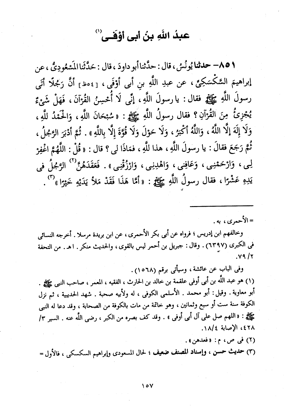 851 - حَدَّثَنَا أَبُو دَاوُدَ قَالَ: حَدَّثَنَا الْمَسْعُودِيُّ، عَنْ إِبْرَاهِيمَ السَّكْسَكِيِّ، عَنْ عَبْدِ اللَّهِ بْنِ أَبِي أَوْفَى، أَنَّ رَجُلًا أَتَى رَسُولَ اللَّهِ صَلَّى اللهُ عَلَيْهِ وَسَلَّمَ فَقَالَ: يَا رَسُولَ اللَّهِ، إِنِّي §لَا أُحْسِنُ الْقُرْآنَ فَهَلْ شَيْءٌ يُجْزِئُ مِنَ الْقُرْآنِ فَقَالَ رَسُولُ اللَّهِ صَلَّى اللهُ عَلَيْهِ وَسَلَّمَ: «سُبْحَانَ اللَّهِ وَالْحَمْدُ لِلَّهِ وَلَا إِلَهَ إِلَّا اللَّهُ وَاللَّهُ أَكْبَرُ وَلَا حَوْلَ وَلَا قُوَّةَ إِلَّا بِاللَّهِ» ثُمَّ أَدْبَرَ الرَّجُلُ ثُمَّ رَجَعَ فَقَالَ: يَا رَسُولَ اللَّهِ، هَذَا لِلَّهِ فَمَاذَا لِي؟ قَالَ: " قُلِ: اللَّهُمَّ اغْفِرْ لِي وَارْحَمْنِي وَعَافِنِي وَاهْدِنِي وَارْزُقْنِي " فَعَقَدَهُنَّ الرَّجُلُ فِي يَدِهِ عَشْرًا فَقَالَ رَسُولُ اللَّهِ صَلَّى اللهُ عَلَيْهِ وَسَلَّمَ: «أَمَّا هَذَا فَقَدْ مَلَأَ يَدَيْهِ خَيْرًا»