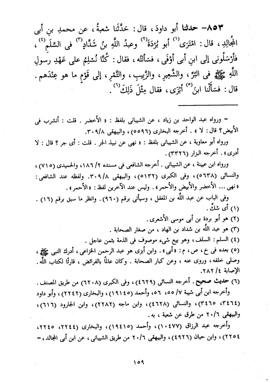 853 - حَدَّثَنَا أَبُو دَاوُدَ قَالَ: حَدَّثَنَا شُعْبَةُ، عَنْ مُحَمَّدِ بْنِ أَبِي الْمُجَالِدِ، قَالَ امْتَرَى أَبُو بُرْدَةَ وَعَبْدُ اللَّهِ بْنُ شَدَّادٍ فِي السَّلَمِ فَأَرْسَلُونِي إِلَى ابْنِ أَبِي أَوْفَى فَسَأَلْتُهُ فَقَالَ: «§كُنَّا نُسْلِمُ عَلَى عَهْدِ رَسُولِ اللَّهِ صَلَّى اللهُ عَلَيْهِ وَسَلَّمَ فِي الْبُرِّ وَالشَّعِيرِ وَالزَّبِيبِ وَالتَّمْرِ إِلَى قَوْمٍ مَا هُوَ عِنْدَهُمْ» قَالَ: فَسَأَلْنَا ابْنَ أَبْزَى فَقَالَ مِثْلَ ذَلِكَ