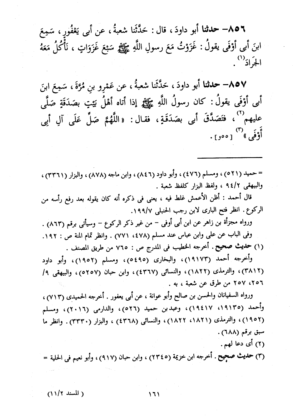 856 - حَدَّثَنَا أَبُو دَاوُدَ قَالَ: حَدَّثَنَا شُعْبَةُ، عَنْ أَبِي يَعْفُورٍ، سَمِعَ ابْنَ أَبِي أَوْفَى، يَقُولُ: «§غَزَوْتُ مَعَ رَسُولِ اللَّهِ صَلَّى اللهُ عَلَيْهِ وَسَلَّمَ سَبْعَ غَزَوَاتٍ نَأْكُلُ مَعَهُ الْجَرَادَ»