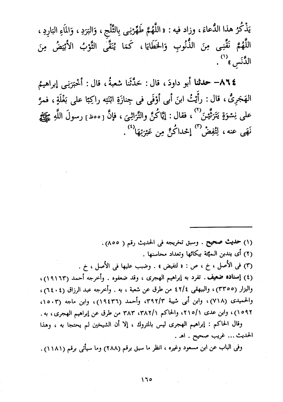 864 - حَدَّثَنَا أَبُو دَاوُدَ قَالَ: حَدَّثَنَا شُعْبَةُ، قَالَ: أَخْبَرَنِي إِبْرَاهِيمُ الْهَجَرِيُّ، قَالَ: رَأَيْتُ ابْنَ أَبِي أَوْفَى فِي جِنَازَةِ ابْنَتِهِ رَاكِبًا عَلَى بَغْلَةٍ فَمَرَّ عَلَى نِسْوَةٍ يَتَرَثَّيْنَ فَقَالَ: «§إِيَّاكُنَّ وَالتَّرَاثِي فَإِنَّ رَسُولَ اللَّهِ صَلَّى اللهُ عَلَيْهِ وَسَلَّمَ نَهَى عَنْهُ» لِتُفِضْ إِحْدَاكُنَّ مِنْ عَبْرَتِهَا