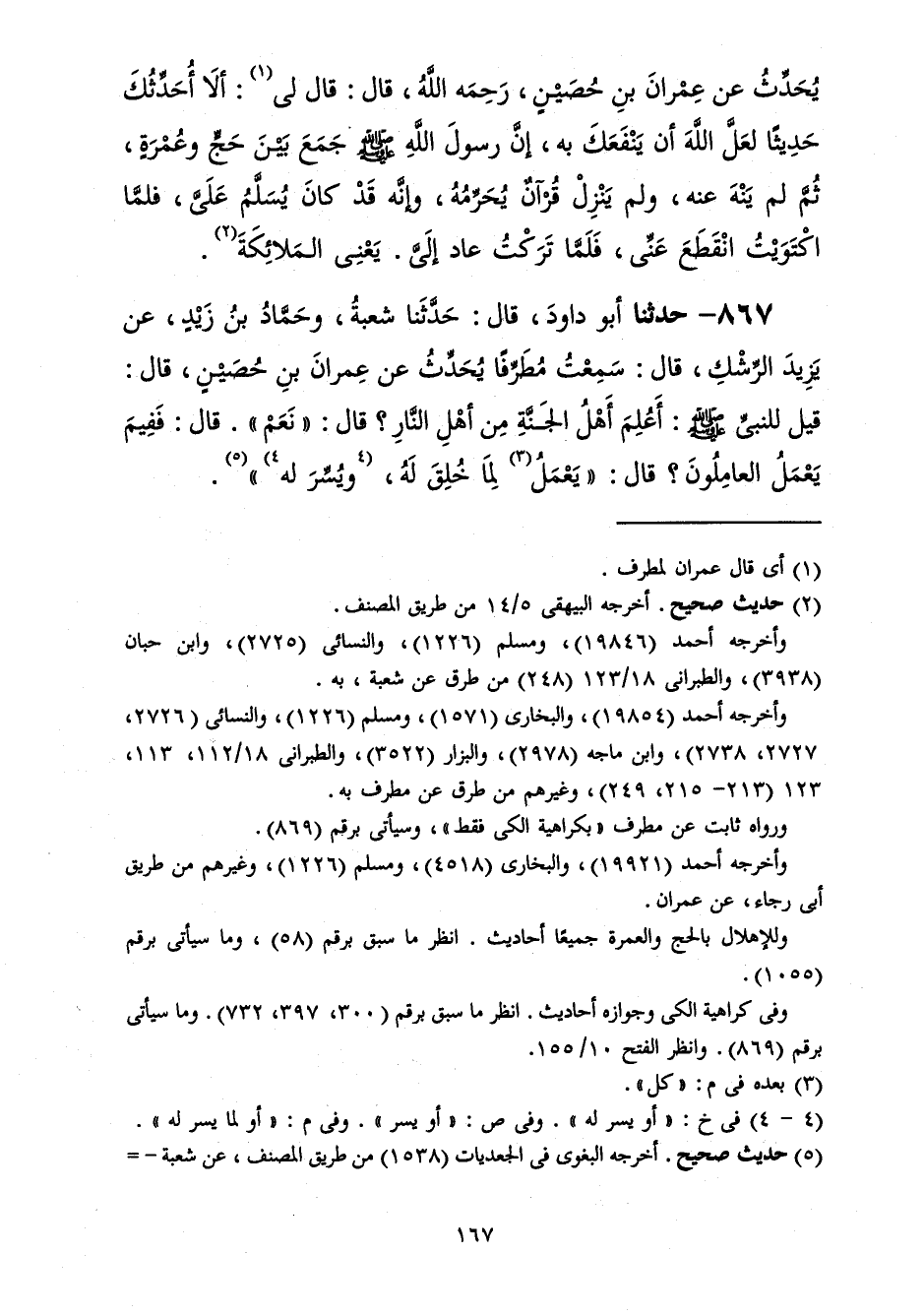 867 - حَدَّثَنَا أَبُو دَاوُدَ قَالَ: حَدَّثَنَا شُعْبَةُ، وَحَمَّادُ بْنُ زَيْدٍ، عَنْ يَزِيدَ الرِّشْكِ، قَالَ: سَمِعْتُ مُطَرِّفًا، يُحَدِّثُ عَنْ عِمْرَانَ بْنِ حُصَيْنٍ، قَالَ: قِيلَ لِلنَّبِيِّ صَلَّى اللهُ عَلَيْهِ وَسَلَّمَ: §أَعُلِمَ أَهْلُ الْجَنَّةِ مِنْ أَهْلِ النَّارِ؟ قَالَ: «نَعَمْ» قَالَ: فَفِيمَ يَعْمَلُ الْعَامِلُونَ؟ قَالَ: «يَعْمَلُ لِمَا خُلِقَ لَهُ وَيُسِّرَ لَهُ»