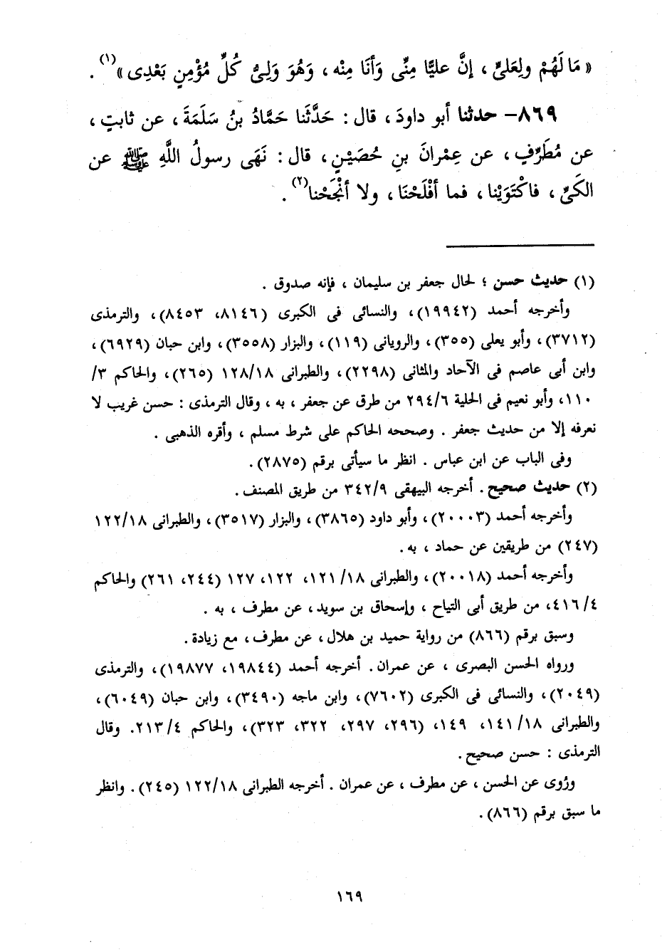 869 - حَدَّثَنَا أَبُو دَاوُدَ قَالَ: حَدَّثَنَا حَمَّادُ بْنُ سَلَمَةَ، عَنْ ثَابِتٍ، عَنْ مُطَرِّفٍ، عَنْ عِمْرَانَ بْنِ حُصَيْنٍ، قَالَ: «§نَهَى رَسُولُ اللَّهِ صَلَّى اللهُ عَلَيْهِ وَسَلَّمَ عَنِ الْكَيِّ فَاكْتَوَيْنَا فَمَا أَفْلَحْنَا وَلَا أَنْجَحْنَا»