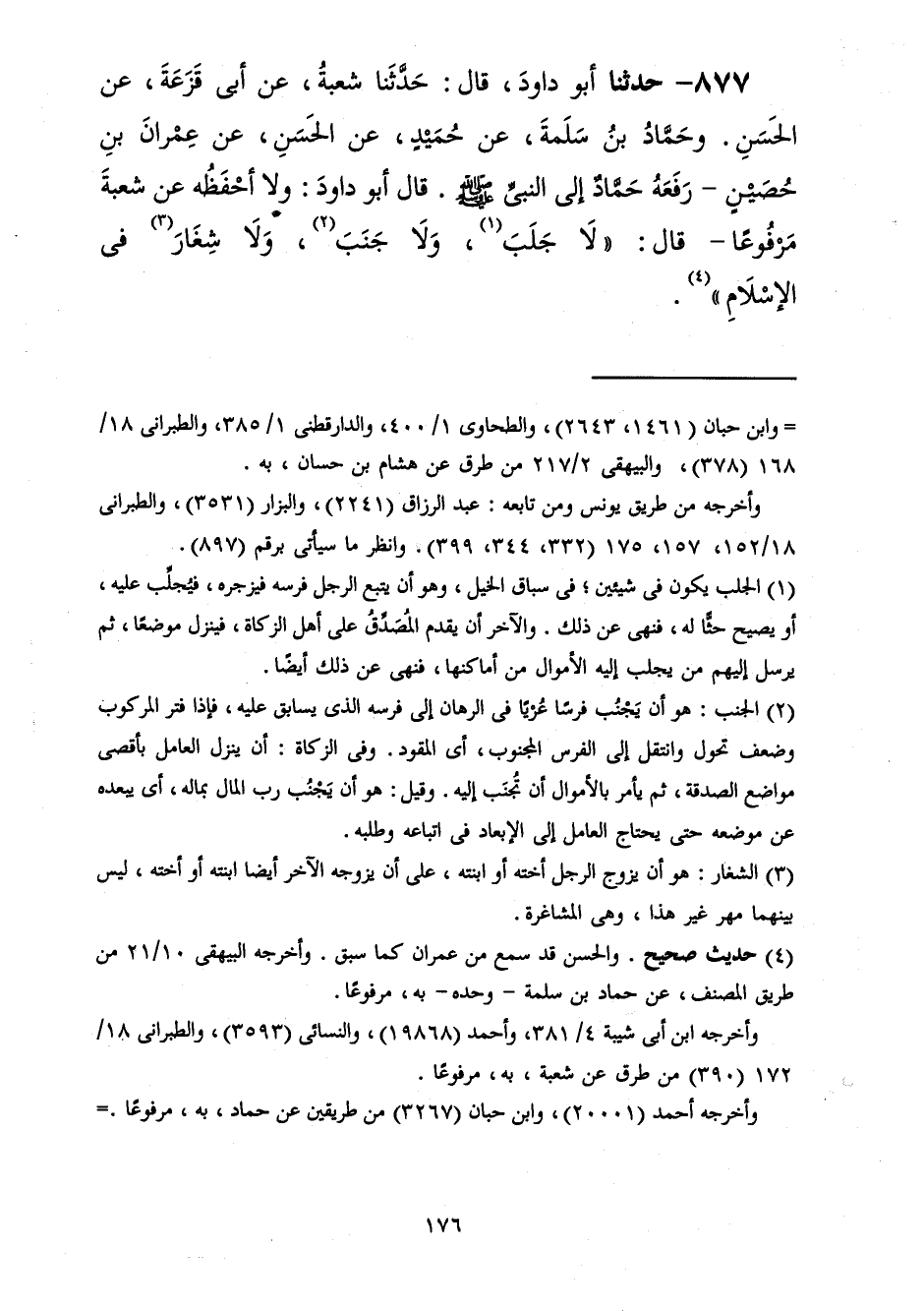 877 - حَدَّثَنَا أَبُو دَاوُدَ قَالَ: حَدَّثَنَا شُعْبَةُ، عَنْ أَبِي قَزَعَةَ، عَنِ الْحَسَنِ، وَحَمَّادِ بْنِ سَلَمَةَ، عَنْ حُمَيْدٍ، عَنِ الْحَسَنِ، عَنْ عِمْرَانَ بْنِ حُصَيْنٍ رَفَعَهُ حَمَّادٌ إِلَى النَّبِيِّ صَلَّى اللهُ عَلَيْهِ وَسَلَّمَ، قَالَ أَبُو دَاوُدَ: وَلَا أَحْفَظُهُ عَنْ شُعْبَةَ مَرْفُوعًا قَالَ: «§لَا جَلَبَ وَلَا جَنَبَ وَلَا شِغَارَ فِي الْإِسْلَامِ»