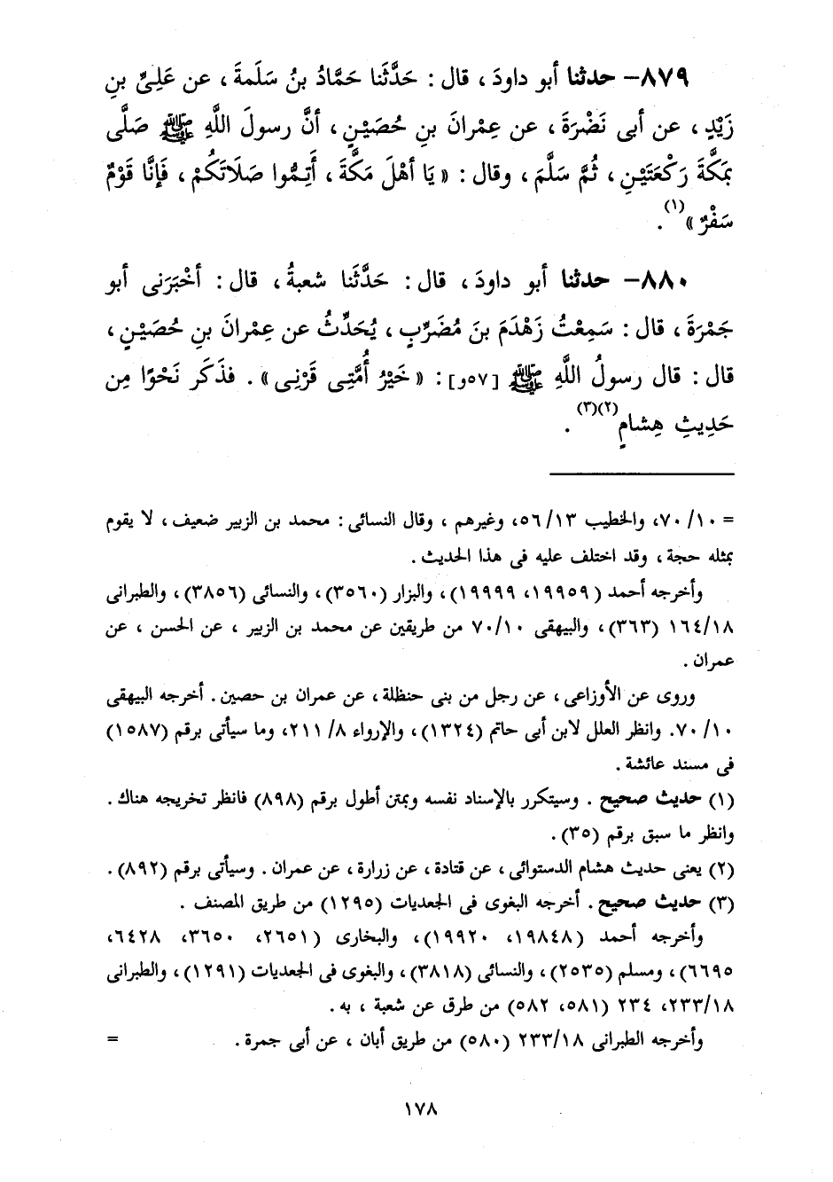879 - حَدَّثَنَا أَبُو دَاوُدَ قَالَ: حَدَّثَنَا حَمَّادُ بْنُ سَلَمَةَ، عَنْ عَلِيِّ بْنِ زَيْدٍ، عَنْ أَبِي نَضْرَةَ، عَنْ عِمْرَانَ بْنِ حُصَيْنٍ، أَنَّ رَسُولَ اللَّهِ صَلَّى اللهُ عَلَيْهِ وَسَلَّمَ صَلَّى بِمَكَّةَ رَكْعَتَيْنِ ثُمَّ سَلَّمَ وَقَالَ: «يَا أَهْلَ مَكَّةَ §أَتِمُّوا صَلَاتَكُمْ فَإِنَّا قَوْمٌ سَفْرٌ»