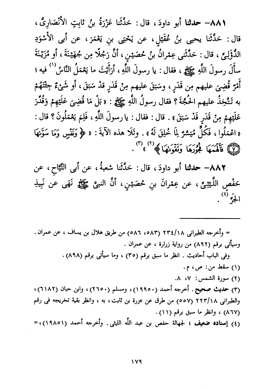 881 - حَدَّثَنَا أَبُو دَاوُدَ قَالَ: حَدَّثَنَا عَزْرَةُ بْنُ ثَابِتٍ الْأَنْصَارِيُّ، قَالَ: حَدَّثَنَا يَحْيَى بْنُ عُقَيْلٍ، عَنْ يَحْيَى بْنِ يَعْمَرَ، عَنْ أَبِي الْأَسْوَدِ الدُّؤَلِيِّ، قَالَ: حَدَّثَنِي عِمْرَانُ بْنُ حُصَيْنٍ، أَنَّ رَجُلًا مِنْ جُهَيْنَةَ أَوْ مُزَيْنَةَ سَأَلَ رَسُولَ اللَّهِ صَلَّى اللهُ عَلَيْهِ وَسَلَّمَ فَقَالَ: يَا رَسُولَ اللَّهِ، أَرَأَيْتَ مَا يَعْمَلُ النَّاسُ فِيهِ أَمْرٌ قُضِيَ عَلَيْهِمْ مِنْ قَدَرٍ وَسَبَقَ عَلَيْهِمْ مِنْ قَدَرٍ قَدْ سَبَقَ أَوْ شَيْءٌ جِئْتَهُمْ بِهِ تَتَّخِذُ عَلَيْهِمُ الْحُجَّةَ؟ فَقَالَ رَسُولُ اللَّهِ صَلَّى اللهُ عَلَيْهِ وَسَلَّمَ: «بَلْ مَا قُضِيَ عَلَيْهِمْ وَقُدِّرَ عَلَيْهِمْ مِنْ قَدَرٍ قَدْ سَبَقَ» . قَالَ: فَقَالَ يَا رَسُولَ اللَّهِ، فَلِمَ يَعْمَلُونَ؟ قَالَ: «§اعْمَلُوا فَكُلٌّ مُيَسَّرٌ لِمَا خُلِقَ لَهُ» وَتَلَا هَذِهِ الْآيَةَ {وَنَفْسٍ وَمَا سَوَّاهَا فَأَلْهَمَهَا فُجُورَهَا وَتَقْوَاهَا} [الشمس: 8]