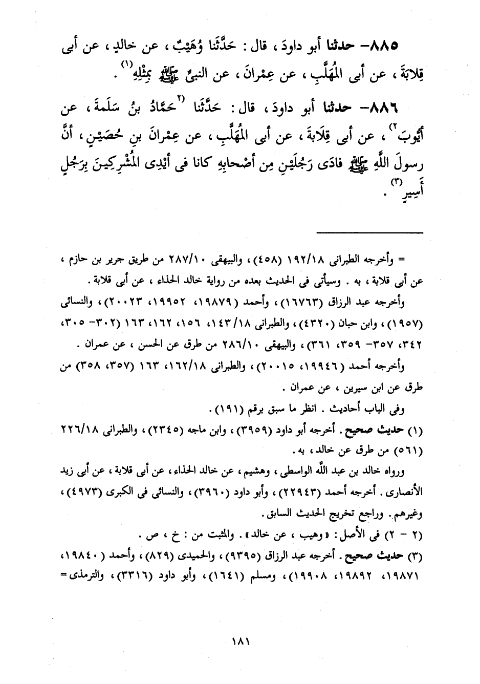 886 - حَدَّثَنَا أَبُو دَاوُدَ قَالَ: حَدَّثَنَا حَمَّادُ بْنُ سَلَمَةَ، عَنْ أَيُّوبَ، عَنْ أَبِي قِلَابَةَ، عَنْ أَبِي الْمُهَلَّبِ، عَنْ عِمْرَانَ بْنِ حُصَيْنٍ، أَنَّ رَسُولَ اللَّهِ صَلَّى اللهُ عَلَيْهِ وَسَلَّمَ «§فَادَى رَجُلَيْنِ مِنْ أَصْحَابِهِ كَانَا فِي أَيْدِي الْمُشْرِكِينَ بِرَجُلٍ أَسِيرٍ»
