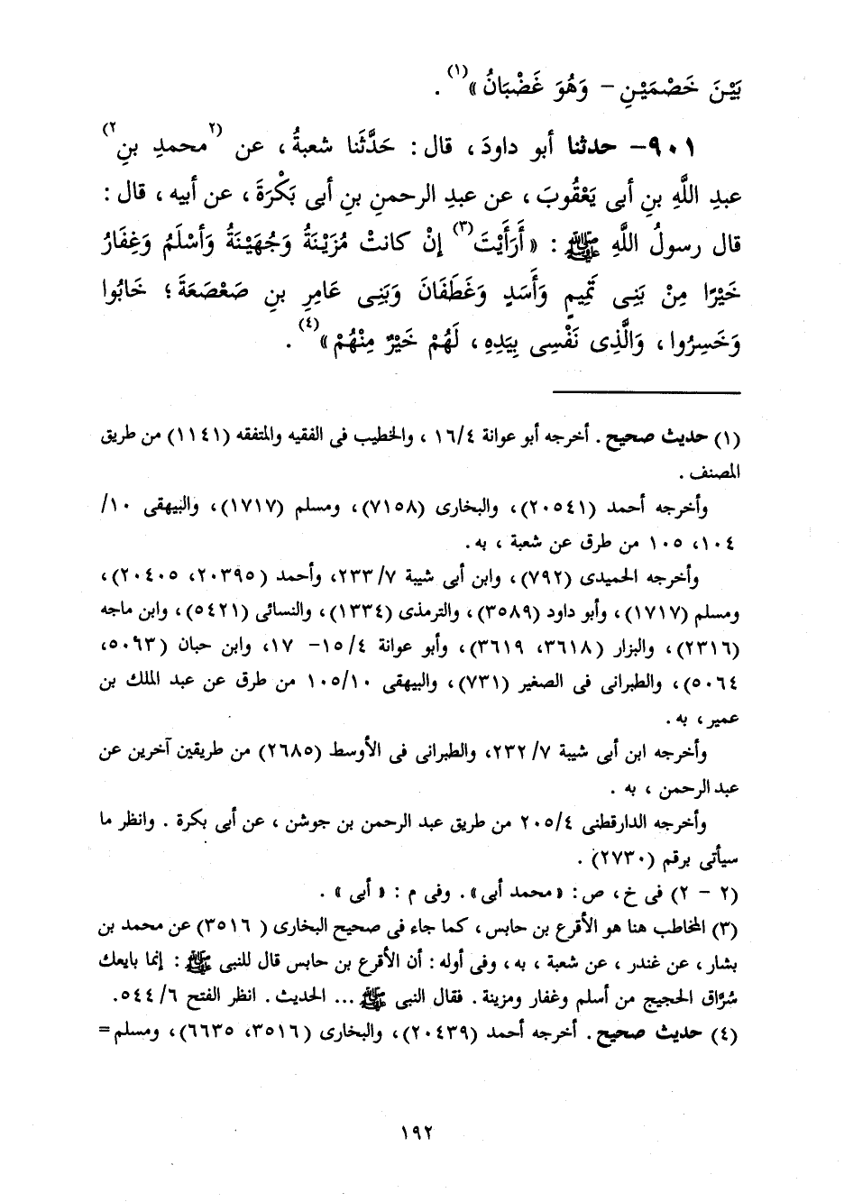 901 - حَدَّثَنَا أَبُو دَاوُدَ قَالَ: حَدَّثَنَا شُعْبَةُ، عَنْ مُحَمَّدِ بْنِ عَبْدِ اللَّهِ بْنِ أَبِي يَعْقُوبَ، عَنْ عَبْدِ الرَّحْمَنِ بْنِ أَبِي بَكْرَةَ، عَنْ أَبِيهِ، قَالَ: قَالَ رَسُولُ اللَّهِ صَلَّى اللهُ عَلَيْهِ وَسَلَّمَ: «§أَرَأَيْتَ إِنْ كَانَتْ مُزَيْنَةُ وَجُهَيْنَةُ وَأَسْلَمُ وَغِفَارٌ خَيْرًا مِنْ بَنِي تَمِيمٍ وَأَسَدٍ وَغَطَفَانَ وَبَنِي عَامِرِ بْنِ صَعْصَعَةَ خَابُوا وَخَسِرُوا وَالَّذِي نَفْسِي بِيَدِهِ لَهُمْ خَيْرٌ مِنْهُمْ»